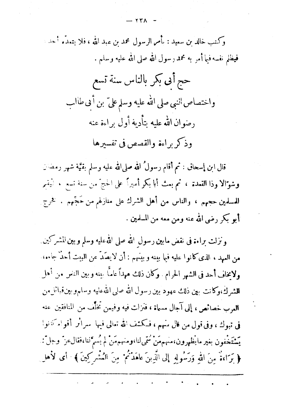 [حَجّ أَبِي بَكْرٍ بالناس سنة تسع واختصاص النّبِيّ صَلّى اللهُ عَلَيْهِ وَسَلّمَ عَلِيّ بْنَ أَبِي طَالِبٍ رِضْوَانُ اللهِ عَلَيْهِ بِتَأْدِيَةِ أَوّلِ بَرَاءَةٍ عَنْهُ وَذِكْرُ بَرَاءَةَ وَالْقَصَصِ فِي تَفْسِيرِهَا]