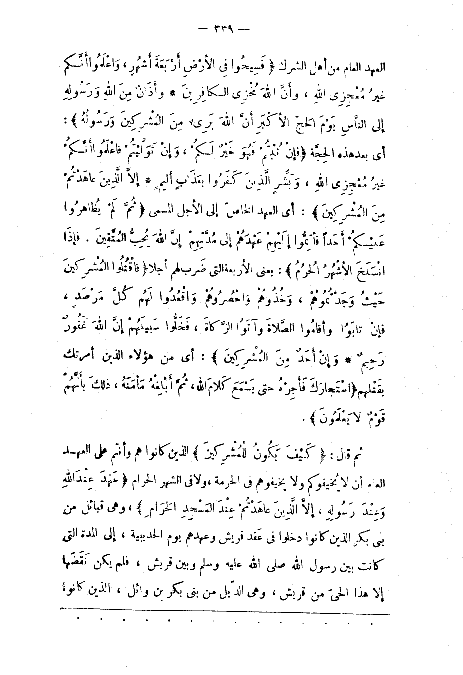 أَيْ بَعْدَ هَذِهِ الْحِجّةِ فَإِنْ تُبْتُمْ فَهُوَ خَيْرٌ لَكُمْ، وَإِنْ تَوَلَّيْتُمْ فَاعْلَمُوا أَنَّكُمْ غَيْرُ مُعْجِزِي اللَّهِ، وَبَشِّرِ الَّذِينَ كَفَرُوا بِعَذابٍ أَلِيمٍ* إِلَّا الَّذِينَ عاهَدْتُمْ مِنَ الْمُشْرِكِينَ: أَيْ العهد الخاصّ إلى الأجل المسمى وَلَمْ يُظاهِرُوا عَلَيْكُمْ أَحَداً فَأَتِمُّوا إِلَيْهِمْ عَهْدَهُمْ إِلى مُدَّتِهِمْ إِنَّ اللَّهَ يُحِبُّ الْمُتَّقِينَ. فَإِذَا انْسَلَخَ الْأَشْهُرُ الْحُرُمُ: يَعْنِي الْأَرْبَعَةَ الّتِي ضَرَبَ لَهُمْ أَجَلًا فَاقْتُلُوا الْمُشْرِكِينَ حَيْثُ وَجَدْتُمُوهُمْ، وَخُذُوهُمْ وَاحْصُرُوهُمْ وَاقْعُدُوا لَهُمْ كُلَّ مَرْصَدٍ، فَإِنْ تابُوا وَأَقامُوا الصَّلاةَ وَآتَوُا الزَّكاةَ، فَخَلُّوا سَبِيلَهُمْ إِنَّ اللَّهَ غَفُورٌ رَحِيمٌ* وَإِنْ أَحَدٌ مِنَ الْمُشْرِكِينَ: أَيْ مِنْ هَؤُلَاءِ الّذِينَ أَمَرْتُك بِقَتْلِهِمْ اسْتَجارَكَ فَأَجِرْهُ حَتَّى يَسْمَعَ كَلامَ اللَّهِ، ثُمَّ أَبْلِغْهُ مَأْمَنَهُ، ذلِكَ بِأَنَّهُمْ قَوْمٌ لَا يَعْلَمُونَ.
