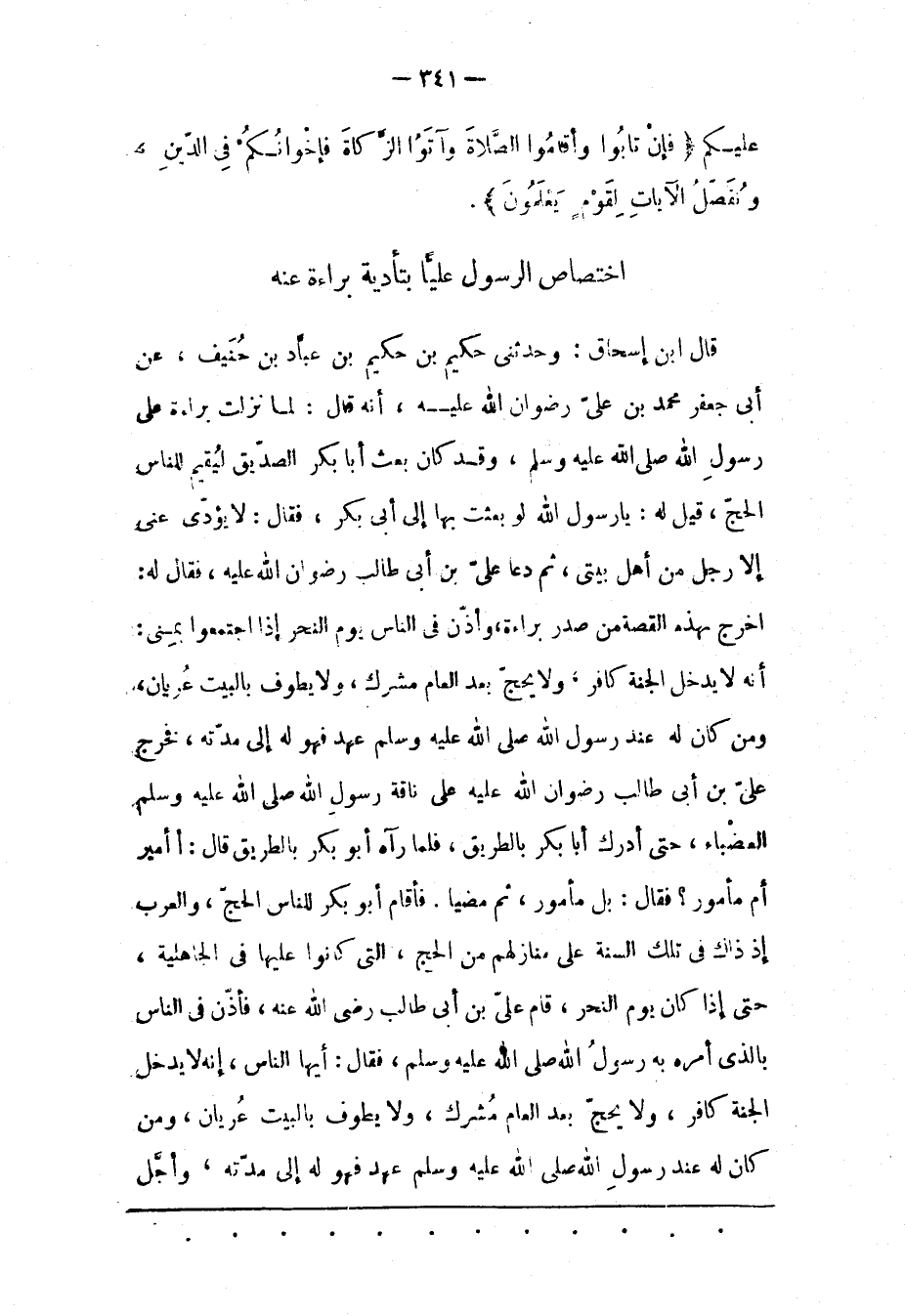 قَالَ ابْنُ إسْحَاقَ: وَحَدّثَنِي حَكِيمُ بْنُ حَكِيمِ بْنِ عَبّادِ بْنِ حُنَيْفٍ، عَنْ أَبِي جَعْفَرٍ مُحَمّدِ بْنِ عَلِيّ رِضْوَانُ اللهِ عَلَيْهِ، أَنّهُ قَالَ: لَمّا نَزَلَتْ بَرَاءَةٌ عَلَى رَسُولِ اللهِ صَلَّى اللَّهُ عَلَيْهِ وَسَلَّمَ، وَقَدْ كَانَ بَعَثَ أَبَا بَكْرٍ الصّدّيقَ لِيُقِيمَ لِلنّاسِ الْحَجّ، قِيلَ لَهُ: يَا رَسُولَ اللهِ لَوْ بَعَثْت بِهَا إلَى أَبِي بَكْرٍ، فَقَالَ: لَا يُؤَدّي عَنّي إلّا رَجُلٌ مِنْ أَهْلِ بَيْتِي، ثُمّ دَعَا عَلِيّ بن أبي طالب رضوان الله عليه، فقال لَهُ: