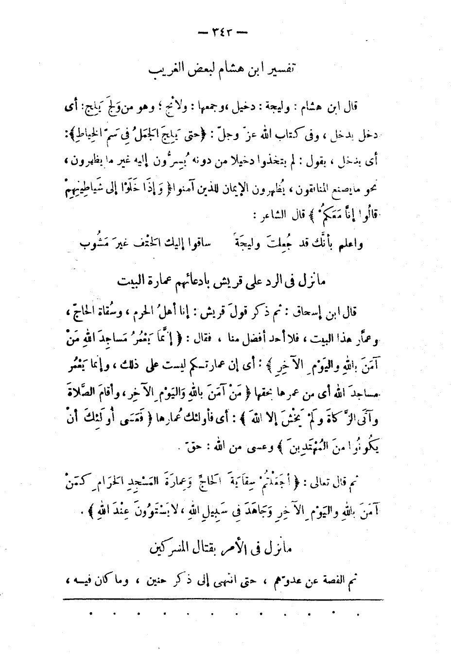 قَالَ ابْنُ إسْحَاقَ: ثُمّ ذَكَرَ قَوْلَ قُرَيْشٍ: إنّا أَهْلُ الْحَرَمِ، وَسُقَاةُ الْحَاجّ، وَعُمّارِ هَذَا الْبَيْتِ، فَلَا أَحَدَ أَفْضَلُ مِنّا، فَقَالَ: إِنَّما يَعْمُرُ مَساجِدَ اللَّهِ مَنْ آمَنَ بِاللَّهِ وَالْيَوْمِ الْآخِرِ