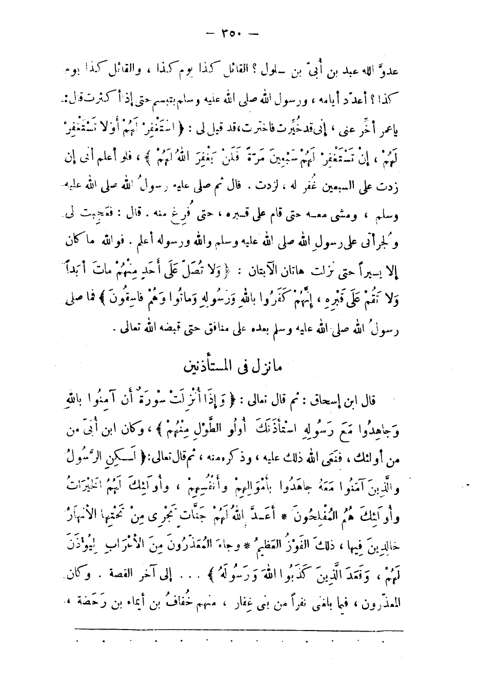 يَا عُمَرُ أَخّرْ عَنّي، إنّي قَدْ خُيّرْت فَاخْتَرْت، قَدْ قِيلَ لِي: اسْتَغْفِرْ لَهُمْ أَوْ لَا تَسْتَغْفِرْ لَهُمْ، إِنْ تَسْتَغْفِرْ لَهُمْ سَبْعِينَ مَرَّةً فَلَنْ يَغْفِرَ اللَّهُ لَهُمْ، فَلَوْ أَعْلَمُ أَنّي إنْ زِدْت عَلَى السّبْعِينَ غُفِرَ لَهُ، لَزِدْت. قَالَ ثُمّ صَلّى عَلَيْهِ رَسُولُ اللهِ صَلّى اللهُ عَلَيْهِ وَسَلّمَ، وَمَشَى مَعَهُ حَتّى قَامَ عَلَى قَبْرِهِ، حَتّى فُرِغَ مِنْهُ. قَالَ: فَعَجِبْت لِي وَلِجُرْأَتِي عَلَى رَسُولِ اللهِ صَلَّى اللَّهُ عَلَيْهِ وَسَلَّمَ وَاَللهُ وَرَسُولُهُ أعلم. فو الله مَا كَانَ إلّا يَسِيرًا حَتّى نَزَلَتْ هَاتَانِ الْآيَتَانِ: وَلا تُصَلِّ عَلى أَحَدٍ مِنْهُمْ ماتَ أَبَداً وَلا تَقُمْ عَلى قَبْرِهِ، إِنَّهُمْ كَفَرُوا بِاللَّهِ وَرَسُولِهِ وَماتُوا وَهُمْ فاسِقُونَ فَمَا صَلّى رَسُولُ اللهِ صَلَّى اللَّهُ عَلَيْهِ وَسَلَّمَ بَعْدَهُ عَلَى مُنَافِقٍ حَتّى قَبَضَهُ اللهُ تَعَالَى.