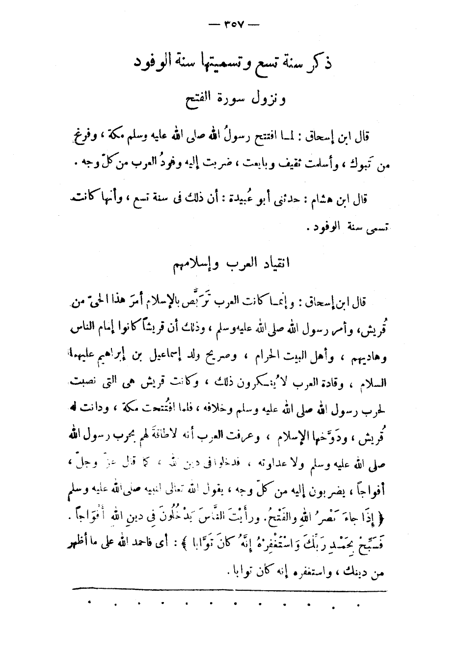 وَإِنّمَا كَانَتْ الْعَرَبُ تَرَبّصُ بِالْإِسْلَامِ أَمْرَ هَذَا الْحَيّ مِنْ قُرَيْشٍ، وَأَمْرَ رَسُولِ اللهِ صَلَّى اللَّهُ عَلَيْهِ وَسَلَّمَ وَذَلِكَ أَنّ قُرَيْشًا كَانُوا إمَامَ النّاسِ وَهَادِيَهُمْ وَأَهْلَ الْبَيْتِ الْحَرَامِ، وَصَرِيحَ وَلَدِ إسْمَاعِيلَ بْنِ إبْرَاهِيمَ عَلَيْهِمَا السّلَامُ وَقَادَةَ الْعَرَبِ لَا يُنْكِرُونَ ذَلِكَ وَكَانَتْ قُرَيْشٌ هِيَ الّتِي نَصَبَتْ لِحَرْبِ رَسُولِ اللهِ صَلَّى اللَّهُ عَلَيْهِ وَسَلَّمَ وَخِلَافِهِ فَلَمّا اُفْتُتِحَتْ مَكّةُ، وَدَانَتْ لَهُ قُرَيْشٌ، وَدَوّخَهَا الْإِسْلَامُ وَعَرَفَتْ الْعَرَبُ أَنّهُ لَا طَاقَةَ لَهُمْ بِحَرْبِ رَسُولِ اللهِ صَلَّى اللَّهُ عَلَيْهِ وَسَلَّمَ وَلَا عَدَاوَتِهِ فَدَخَلُوا فِي دِينِ اللهِ كَمَا قَالَ عَزّ وَجَلّ أَفْوَاجًا، يَضْرِبُونَ إلَيْهِ مِنْ كُلّ وَجْهٍ يَقُولُ اللهُ تَعَالَى لِنَبِيّهِ صَلَّى اللَّهُ عَلَيْهِ وَسَلَّمَ {إِذَا جَاءَ نَصْرُ اللهِ وَالْفَتْحُ وَرَأَيْتَ النّاسَ يَدْخُلُونَ فِي دِينِ اللهِ أَفْوَاجًا فَسَبّحْ بِحَمْدِ رَبّكَ وَاسْتَغْفِرْهُ إِنّهُ كَانَ تَوَّاباً} [النَّصْر:1،3] أَيْ فَاحْمَدْ اللهَ عَلَى مَا أَظْهَرَ مِنْ دِينِك، وَاسْتَغْفِرْهُ إنّهُ كَانَ تَوّابًا.