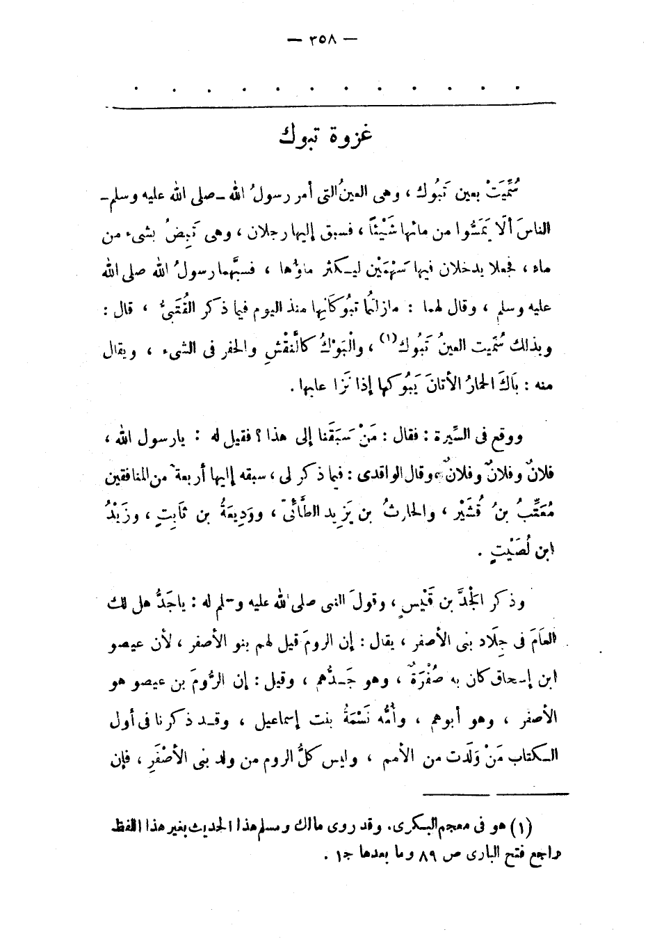 غَزْوَةُ تَبُوكَ سُمّيَتْ بِعَيْنِ تَبُوكَ، وَهِيَ الْعَيْنُ الّتِي أَمَرَ رَسُولُ الله- صَلَّى اللَّهُ عَلَيْهِ وَسَلَّمَ- النّاسَ أَلَا يَمَسّوا مِنْ مَائِهَا شَيْئًا، فَسَبَقَ إلَيْهَا رَجُلَانِ، وَهِيَ تَبِضُ بِشَيْءٍ مِنْ مَاءٍ، فَجَعَلَا يُدْخِلَانِ فِيهَا سَهْمَيْنِ لِيَكْثُرَ مَاؤُهَا، فَسَبّهُمَا رَسُولُ اللهِ صَلَّى اللَّهُ عَلَيْهِ وَسَلَّمَ، وَقَالَ لَهُمَا: مَا زُلْتُمَا تَبُوكَانِهَا مُنْذُ الْيَوْم فِيمَا ذَكَرَ الْقُتَبِيّ، قَالَ: