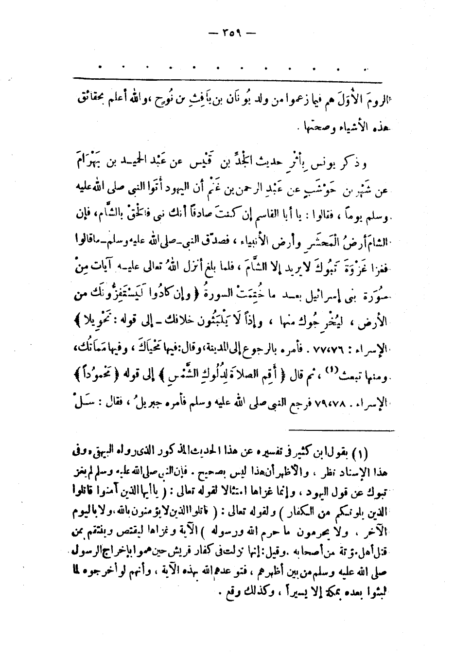 (1) بقول ابن كثير فى تفسيره عن هذا الحديث المذكور الذى رواه البيهقى «وفى هذا الإسناد نظر، والأظهر أن هذا ليس بصحيح. فإن النبى صلى الله عليه وسلم لم يغز تبوك عن قول اليهود، وإنما غزاها امتثالا لقوله تعالى: (يا أَيُّهَا الَّذِينَ آمَنُوا قاتِلُوا الَّذِينَ يَلُونَكُمْ مِنَ الْكُفَّارِ) ولقوله تعالى: (قاتِلُوا الَّذِينَ لَا يُؤْمِنُونَ بِاللَّهِ وَلا بِالْيَوْمِ الْآخِرِ، وَلا يُحَرِّمُونَ مَا حَرَّمَ اللَّهُ وَرَسُولُهُ) الآية وغزاها ليقتص وينتقم بمن قتل أهل مؤتة من أصحابه. وقيل: إنها نزلت فى كفار قريش حين هموا بإخراج الرسول صلى الله عليه وسلم من بين أظهرهم، فتوعدهم الله بهذه الآية، وأنهم لو أخرجوه لما لبثوا بعده بمكة إلا يسيرا، وكذلك وقع.