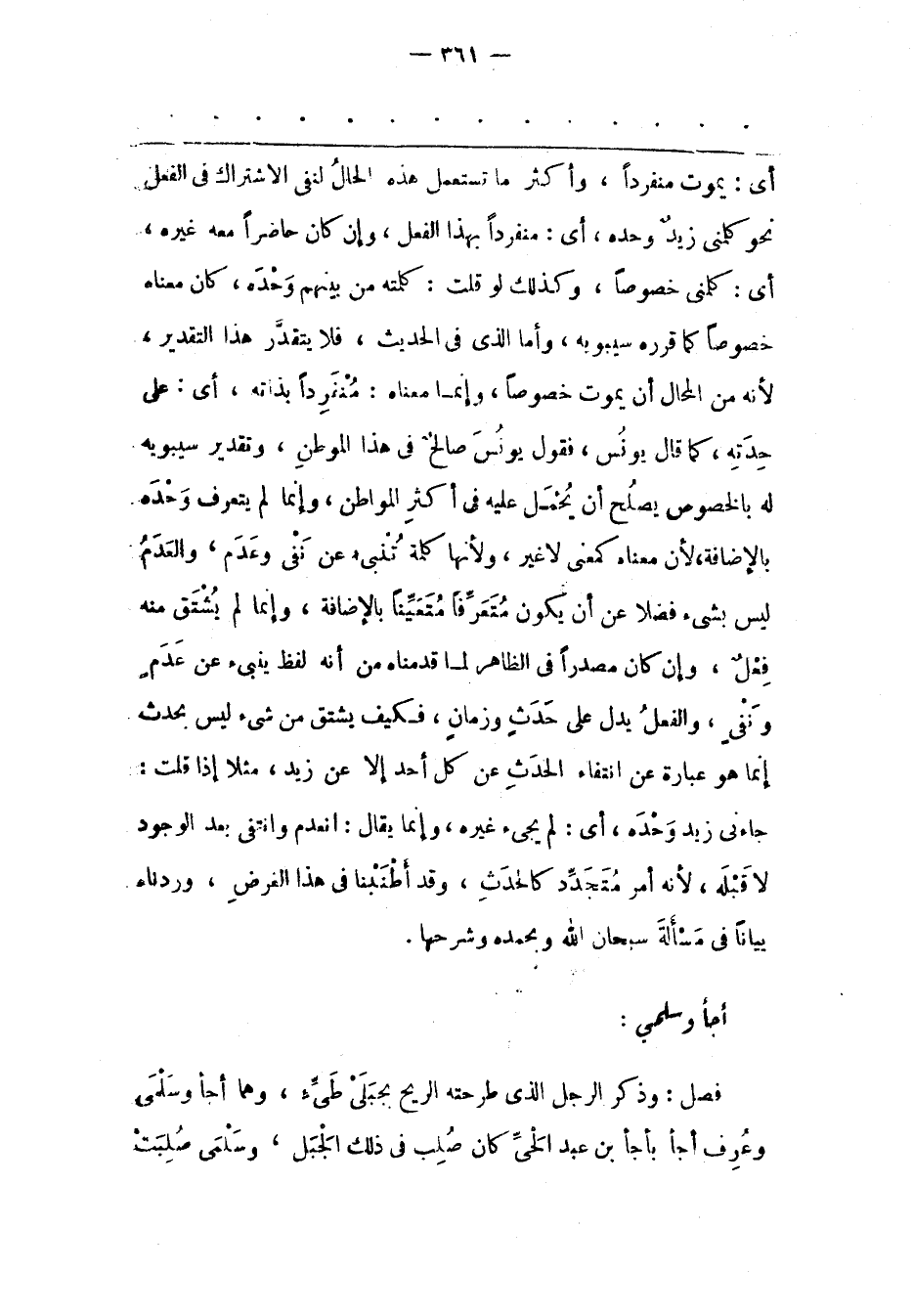 جَاءَنِي زَيْدٌ وَحْدَهُ، أَيْ: لَمْ يَجِئْ غَيْرُهُ، وَإِنّمَا يُقَالُ: انْعَدَمَ وَانْتَفَى بَعْدَ الْوُجُودِ لَا قَبْلَهُ، لِأَنّهُ أَمْرٌ مُتَجَدّدٌ كَالْحَدَثِ، وقد أطنبنا فى هذا الغرض، وردناه بَيَانًا فِي مَسْأَلَةِ سُبْحَانَ اللهِ وَبِحَمْدِهِ وَشَرْحِهَا.