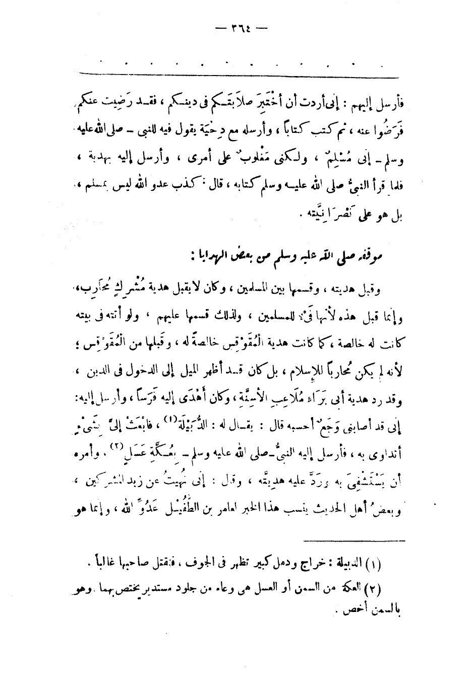 وَقَبِلَ هَدِيّتَهُ، وَقَسّمَهَا بَيْنَ الْمُسْلِمِينَ، وَكَانَ لَا يَقْبَلُ هَدِيّةَ مُشْرِكٍ مُحَارِبٍ، وَإِنّمَا قَبِلَ هَذِهِ لِأَنّهَا فَيْءٌ لِلْمُسْلِمِينَ، وَلِذَلِكَ قَسّمَهَا عَلَيْهِمْ، وَلَوْ أَتَتْهُ فِي بَيْتِهِ كَانَتْ لَهُ خَالِصَةً، كَمَا كَانَتْ هَدِيّةُ الْمُقَوْقِسِ خَالِصَةً لَهُ، وَقَبِلَهَا مِنْ الْمُقَوْقِسِ؛ لِأَنّهُ لَمْ يَكُنْ مُحَارِبًا لِلْإِسْلَامِ، بَلْ كَانَ قَدْ أَظْهَرَ الْمَيْلَ إلَى الدّخُولِ فِي الدّينِ.