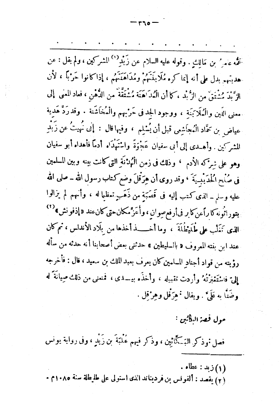 عَمّهُ عَامِرُ بْنُ مَالِكٍ. وَقَوْلُهُ عَلَيْهِ السّلَامُ عَنْ زَبْدِ «1» الْمُشْرِكِينَ، وَلَمْ يَقُلْ: عَنْ هَدِيّتِهِمْ يَدُلّ عَلَى أَنّهُ إنّمَا كَرِهَ مُلَايَنَتَهُمْ وَمُدَاهَنَتَهُمْ، إذَا كَانُوا حَرْبًا، لِأَنّ الزّبْدَ مُشْتَقّ مِنْ الزّبْدِ، كَمَا أَنّ الْمُدَاهَنَةَ مُشْتَقّةٌ مِنْ الدّهْنِ، فَعَادَ الْمَعْنَى إلَى مَعْنَى اللّينِ وَالْمُلَايَنَةِ، وَوُجُودِ الْجِدّ فِي حَرْبِهِمْ وَالْمُخَاشَنَةِ. وَقَدْ رَدّ هَدِيّةَ عياض بن حمّاد الْمُجَاشِعِيّ قَبْلَ أَنْ يُسْلِمَ، وَفِيهَا قَالَ: إنّي نُهِيت عَنْ زَبْدِ الْمُشْرِكِينَ. وَأَهْدَى إلَى أَبِي سُفْيَانَ عَجْوَةً وَاسْتَهْدَاهُ أَدَمًا فَأَهْدَاهُ أَبُو سُفْيَانَ وَهُوَ عَلَى شِرْكِهِ الْأَدَمَ، وَذَلِك فِي زَمَنِ الْهُدْنَةِ الّتِي كَانَتْ بَيْنَهُ وَبَيْنَ الْمُسْلِمِينَ فِي صُلْحِ الْحُدَيْبِيَةِ، وَقَدْ رُوِيَ أَنّ هِرَقْلَ وَضَعَ كِتَابُ رَسُولِ اللهِ- صَلّى اللهُ عَلَيْهِ وَسَلّمَ- الّذِي كَتَبَ إلَيْهِ فِي قَصَبَةٍ مِنْ ذَهَبٍ تعظيما له، وأنهم لم يزالوا يتوراثونه كارا عَنْ كَابِرٍ فِي أَرْفَعِ صِوَانٍ، وَأَعَزّ مَكَانٍ حَتّى كَانَ عِنْدَ «إذفونش» «2» الّذِي تَغَلّبَ عَلَى طُلَيْطِلَةَ، وَمَا أَخَذَ أَخَذَهَا مِنْ بِلَادِ الْأَنْدَلُسِ، ثُمّ كَانَ عِنْدَ ابْنِ بِنْتِهِ الْمَعْرُوفِ «بِالسّلِيطِينَ» حَدّثَنِي بَعْضُ أَصْحَابِنَا أَنّهُ حَدّثَهُ مَنْ سَأَلَهُ رُؤْيَتَهُ مِنْ قُوّادِ أَجْنَادِ الْمُسْلِمِينَ كَانَ يُعْرَفُ بِعَبْدِ الْمَلِكِ بْنِ سَعِيدٍ، قَالَ: فَأَخْرَجَهُ إلَيّ فَاسْتَعْبَرْته وَأَرَدْت تَقْبِيلَهُ، وَأَخْذَهُ بِيَدِي، فَمَنَعَنِي مِنْ ذَلِكَ صِيَانَةً لَهُ وَضَنّا بِهِ عَلَيّ. وَيُقَالُ: هِرَقْلُ وَهِرْقِلُ.