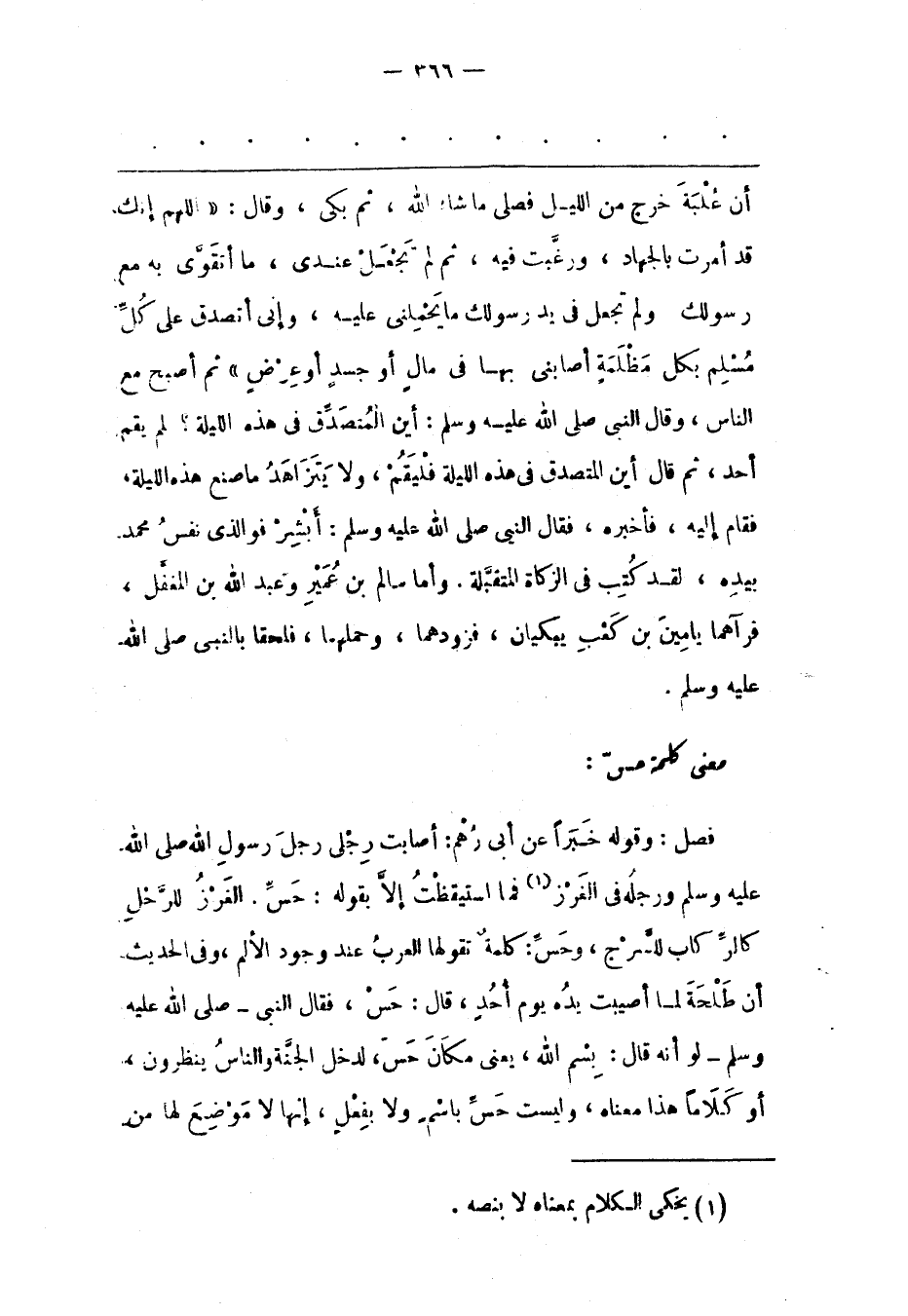 فَصْلٌ: وَقَوْلُهُ خَبَرًا عَنْ أَبِي رُهْمٍ: أَصَابَتْ رِجْلِي رِجْلَ رَسُولِ اللهِ صَلَّى اللَّهُ عَلَيْهِ وَسَلَّمَ وَرِجْلُهُ فِي الْغَرْزِ «1» فَمَا اسْتَيْقَظْت إلّا بِقَوْلِهِ: حَسّ. الْغَرْزُ لِلرّحْلِ كَالرّكَابِ لِلسّرْجِ، وَحَسّ: كَلِمَةٌ تَقُولُهَا الْعَرَبُ عِنْدَ وُجُودِ الْأَلَمِ، وَفِي الْحَدِيثِ أَنّ طَلْحَةَ لَمّا أُصِيبَتْ يَدُهُ يَوْمَ أُحُدٍ، قَالَ: حَسّ، فَقَالَ النّبِيّ- صَلَّى اللَّهُ عَلَيْهِ وَسَلَّمَ- لَوْ أَنّهُ قَالَ: بِسْمِ اللهِ، يَعْنِي مَكَانَ حَسّ، لَدَخَلَ الْجَنّةَ وَالنّاسُ يَنْظُرُونَ، أَوْ كَلَامًا هَذَا مَعْنَاهُ، وَلَيْسَتْ حَسّ بِاسْمٍ وَلَا بِفِعْلٍ، إنّهَا لا موضع لها من