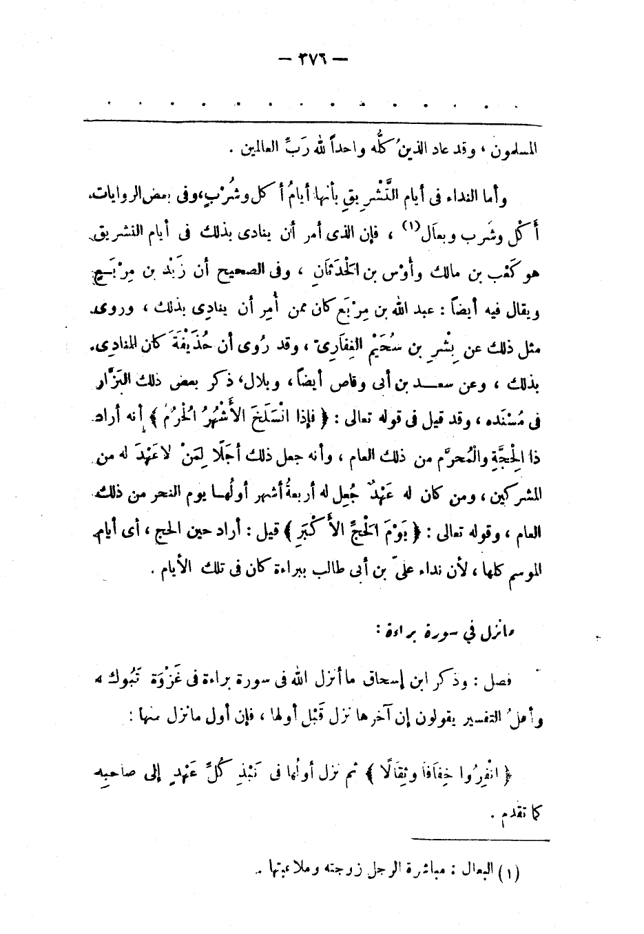 وَأَمّا النّدَاءُ فِي أَيّامِ التّشْرِيقِ بِأَنّهَا أَيّامُ أَكْلٍ وَشُرْبٍ، وَفِي بَعْضِ الرّوَايَاتِ أَكْلٍ وَشُرْبٍ وَبِعَالٍ «1» ، فَإِنّ الّذِي أُمِرَ أَنْ يُنَادِيَ بِذَلِكَ فِي أَيّامِ التّشْرِيقِ هُوَ كَعْبُ بْنُ مَالِكٍ وَأَوْسُ بْنُ الْحَدَثَانِ، وَفِي الصّحِيحِ أَنّ زَيْدَ بْنَ مِرْبَعٍ وَيُقَالُ فِيهِ أَيْضًا: عَبْدُ اللهِ بْنُ مِرْبَعٍ كَانَ مِمّنْ أُمِرَ أَنْ يُنَادِيَ بِذَلِكَ، وَرُوِيَ مِثْلُ ذَلِكَ عَنْ بِشْرِ بْنِ سُحَيْمٍ الْغِفَارِيّ، وَقَدْ رُوِيَ أَنّ حُذَيْفَةَ كَانَ الْمُنَادِيَ بِذَلِكَ، وَعَنْ سَعْدِ بْنِ أَبِي وَقّاصٍ أَيْضًا، وَبِلَالٍ، ذَكَرَ بَعْضَ ذَلِكَ الْبَزّارُ فِي مُسْنَدِهِ، وَقَدْ قِيلَ فِي قَوْلِهِ تَعَالَى: فَإِذَا انْسَلَخَ الْأَشْهُرُ الْحُرُمُ أَنّهُ أَرَادَ ذَا الْحِجّةِ وَالْمُحَرّمَ مِنْ ذَلِكَ الْعَامِ، وَأَنّهُ جَعَلَ ذَلِكَ أَجَلًا لِمَنْ لَا عَهْدَ لَهُ مِنْ الْمُشْرِكِينَ، وَمَنْ كَانَ لَهُ عَهْدٌ جَعَلَ لَهُ أَرْبَعَةَ أَشْهُرٍ أَوّلُهَا يَوْمُ النّحْرِ مِنْ ذَلِكَ الْعَامِ، وَقَوْلُهُ تَعَالَى: يَوْمَ الْحَجِّ الْأَكْبَرِ قِيلَ: أَرَادَ حِينَ الْحَجّ، أَيْ أَيّامَ الْمَوْسِمِ كُلّهَا، لِأَنّ نِدَاءَ عَلِيّ بْنِ أَبِي طَالِبٍ بِبَرَاءَةٌ كَانَ فِي تِلْكَ الْأَيّامِ.