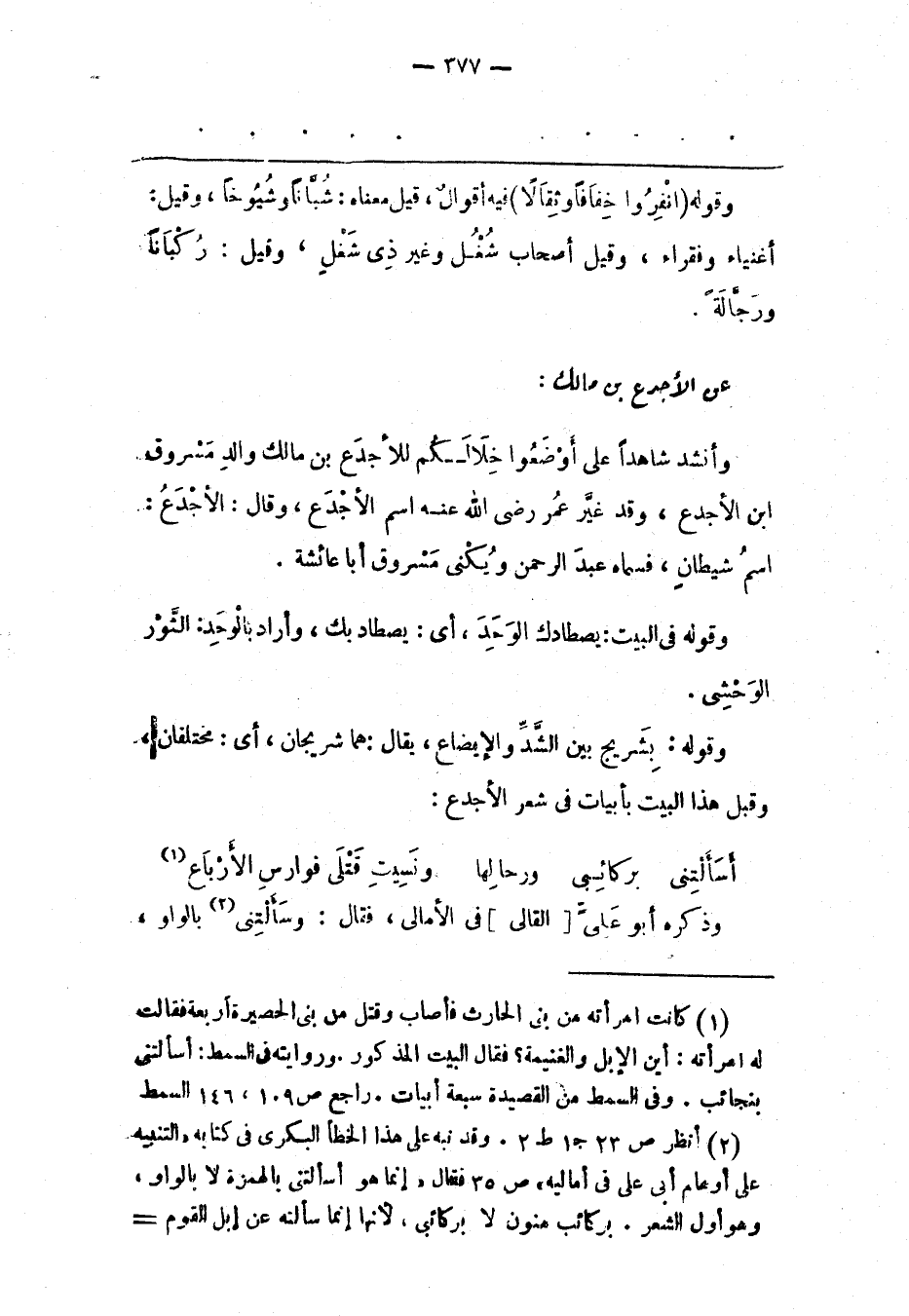 (1) كانت امرأته من بنى الحارث فأصاب وقتل من بنى الحصيرة أربعة فقالت له امرأته: أين الإبل والغنيمة؟ فقال البيت المذكور. وروايته فى السمط: أسألتنى بنجائب. وفى السمط من القصيدة سبعة أبيات. راجع ص 109، 146 السمط.