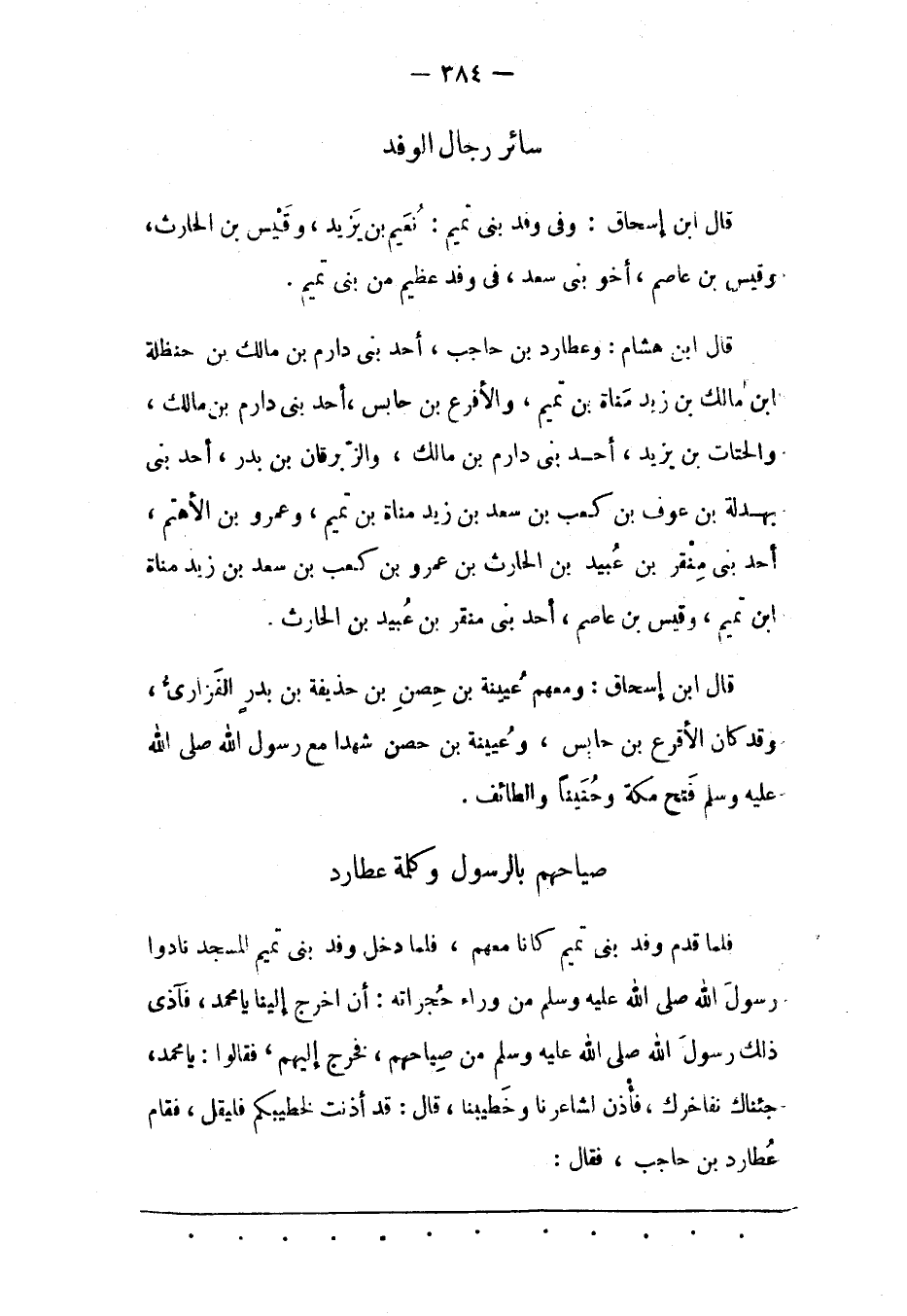 قَالَ ابْنُ هِشَامٍ: وَعُطَارِدُ بْنُ حَاجِبٍ، أَحَدُ بنى دارم بن مالك بن حنظلة ابن مالك بن زيد مناة بن تميم، والأفرع بْنُ حَابِسٍ، أَحَدُ بَنِي دَارِمِ بْنِ مَالِكٍ، وَالْحُتَاتُ بْنُ يَزِيدَ، أَحَدُ بَنِي دَارِمِ بْنِ مَالِكٍ، وَالزّبْرِقَانُ بْنُ بَدْرٍ، أَحَدُ بَنِي بَهْدَلَةَ بْنِ عَوْفِ بْنِ كَعْبِ بْنِ سَعْدِ بْنِ زَيْدٍ مَنَاةَ بْنِ تَمِيمٍ، وَعَمْرُو بْنُ الْأَهْتَمِ، أَحَدُ بَنِي مِنْقَرِ بْنِ عُبَيْدِ بْنِ الْحَارِثِ بْنِ عَمْرِو بْنِ كَعْبِ بْنِ سَعْدِ بْنِ زَيْدِ مَنَاةَ ابن تَمِيمٍ، وَقِيسِ بْنِ عَاصِمٍ، أَحَدُ بَنِي مِنْقَرِ بْنِ عُبَيْدِ بْنِ الْحَارِثِ.