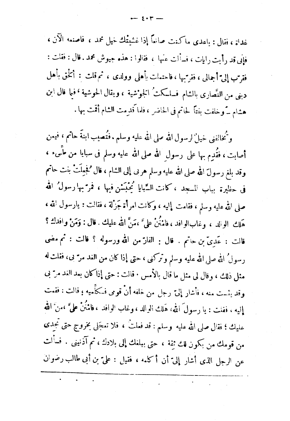 وَتُخَالِفُنِي خَيْلٌ لِرَسُولِ اللهِ صَلّى اللهُ عَلَيْهِ وَسَلّمَ، فَتُصِيبُ ابْنَةَ حَاتِمٍ، فِيمَنْ أَصَابَتْ، فَقُدِمَ بِهَا عَلَى رَسُولِ اللهِ صَلَّى اللَّهُ عَلَيْهِ وَسَلَّمَ فى سبايا من طىّء، وَقَدْ بَلَغَ رَسُولَ اللهِ صَلّى اللهُ عَلَيْهِ وَسَلّمَ هَرَبِي إلَى الشّامِ، قَالَ فَجُعِلَتْ بِنْتُ حَاتِمٍ فِي حَظِيرَةٍ بِبَابِ الْمَسْجِدِ، كَانَتْ السّبَايَا يُحْبَسْنَ فِيهَا، فَمَرّ بِهَا رَسُولُ اللهِ صَلّى اللهُ عَلَيْهِ وَسَلّمَ، فَقَامَتْ إلَيْهِ، وَكَانَتْ امْرَأَةً جَزْلَةً، فَقَالَتْ: يَا رَسُولَ اللهِ، هَلَكَ الْوَالِدُ، وَغَابَ الْوَافِدُ، فَامْنُنْ عَلَيّ، مَنّ اللهُ عَلَيْك. قَالَ: وَمَنْ وَافِدُك؟