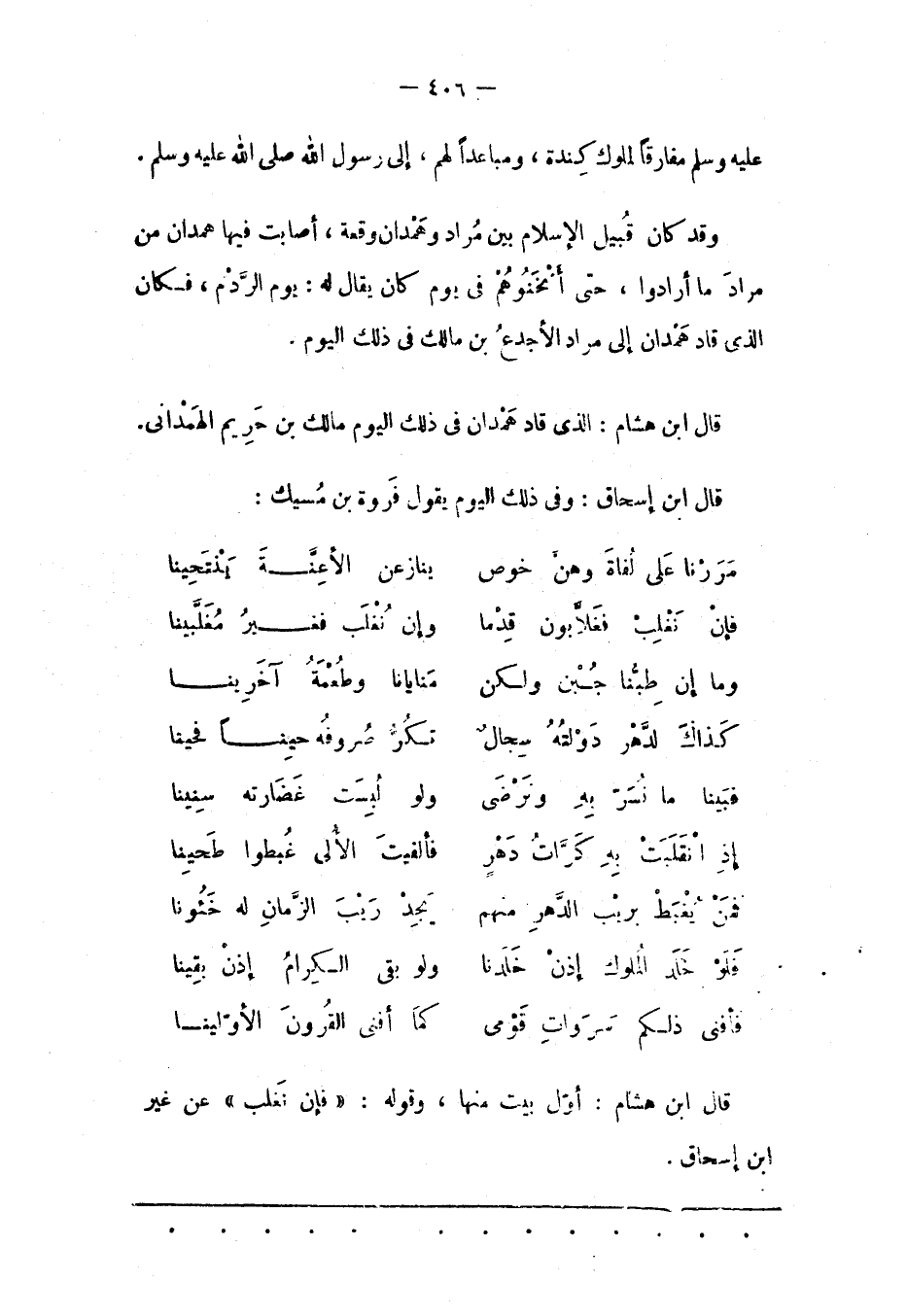 قَالَ ابْنُ هِشَامٍ: أَوّلُ بَيْتٍ مِنْهَا، وَقَوْلُهُ: «فَإِنْ نَغْلِبْ» عَنْ غَيْرِ ابن إسحاق.