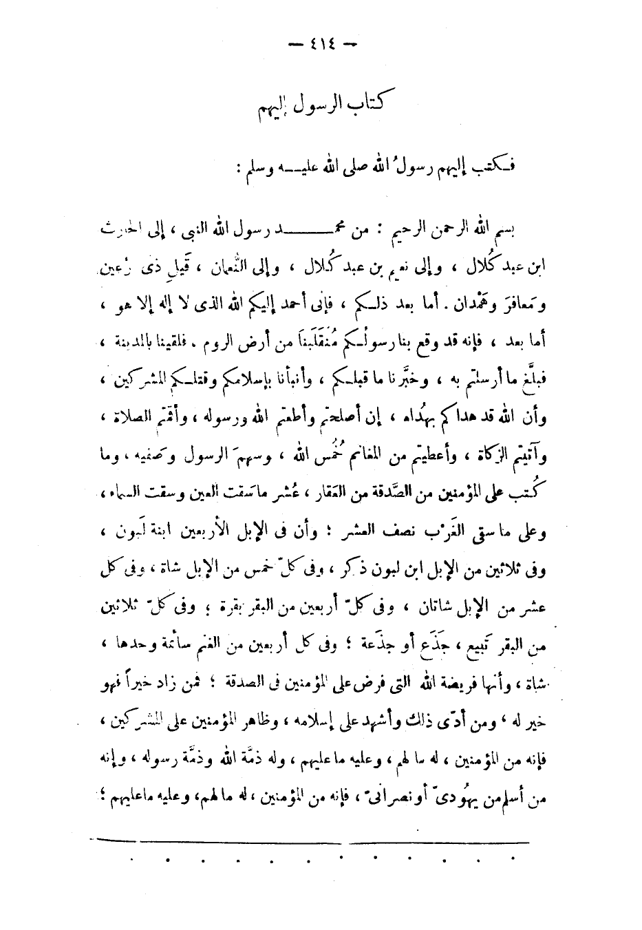 بِسْمِ اللهِ الرّحْمَنِ الرّحِيمِ: مِنْ مُحَمّدٍ رَسُولِ الله النبى، إلى الحارث ابن عَبْدِ كُلَالٍ، وَإِلَى نُعَيْمِ بْنِ عَبْدِ كُلَالٍ، وَإِلَى النّعْمَانِ، قَيْلِ ذِي رُعَيْنٍ وَمَعَافِرَ وَهَمْدَانَ. أَمّا بَعْدُ ذَلِكُمْ، فَإِنّي أَحْمَدُ إلَيْكُمْ اللهَ الّذِي لَا إلَهَ إلّا هُوَ، أَمّا بَعْدُ، فإنه قد وقع بنا رسولكم منقلبنا من أرض الروم، فلقينا بالمدينة، فبلّغ ما أرسلتم به، وخبّرنا مَا قَبْلَكُمْ، وَأَنْبَأْنَا بِإِسْلَامِكُمْ وَقَتْلِكُمْ الْمُشْرِكِينَ، وَأَنّ اللهَ قَدْ هَدَاكُمْ بِهُدَاهُ، إنْ أَصْلَحْتُمْ وَأَطَعْتُمْ اللهَ وَرَسُولَهُ، وَأَقَمْتُمْ الصّلَاةَ، وَآتَيْتُمْ الزّكَاةَ، وَأَعْطَيْتُمْ مِنْ الْمَغَانِمِ خُمُسَ اللهِ، وَسَهْمَ الرّسُولِ وَصَفِيّهُ، وَمَا كُتِبَ عَلَى الْمُؤْمِنِينَ مِنْ الصّدَقَةِ مِنْ الْعَقَارِ، عُشْرَ مَا سَقَتْ الْعَيْنُ وَسَقَتْ السّمَاءُ، وَعَلَى مَا سَقَى الْغَرْبُ نِصْفُ الْعُشْرِ: وَأَنّ فِي الْإِبِلِ الْأَرْبَعِينَ ابْنَةَ لَبُونٍ، وَفِي ثَلَاثِينَ مِنْ الْإِبِلِ ابْنُ لَبُونٍ ذَكَرٍ، وَفِي كُلّ خُمُسٍ مِنْ الْإِبِلِ شَاةٌ، وَفِي كُلّ عَشْرٍ مِنْ الْإِبِلِ شَاتَانِ، وَفِي كُلّ أَرْبَعِينَ مِنْ الْبَقَرِ بَقَرَةٌ؛ وَفِي كُلّ ثَلَاثِينَ مِنْ الْبَقَرِ تَبِيعٌ، جَذَعٌ أَوْ جَذَعَةٌ؛ وَفِي كُلّ أَرْبَعِينَ مِنْ الْغَنَمِ سَائِمَةٌ وَحْدَهَا، شَاةٌ، وَأَنّهَا فَرِيضَةُ اللهِ الّتِي فَرَضَ عَلَى الْمُؤْمِنِينَ فِي الصّدَقَةِ؛ فَمَنْ زَادَ خَيْرًا فَهُوَ خَيْرٌ لَهُ، وَمَنْ أَدّى ذَلِكَ وَأَشْهَدَ عَلَى إسْلَامِهِ، وَظَاهَرَ الْمُؤْمِنِينَ على المشركين، فإنه من المؤمنين، له سالهم، وَعَلَيْهِ مَا عَلَيْهِمْ، وَلَهُ ذِمّةُ اللهِ وَذِمّةُ رَسُولِهِ، وَإِنّهُ مَنْ أَسْلَمَ مِنْ يَهُودِيّ أَوْ نَصْرَانِيّ، فَإِنّهُ مِنْ الْمُؤْمِنِينَ، لَهُ مَا لَهُمْ، وَعَلَيْهِ مَا عَلَيْهِمْ؛