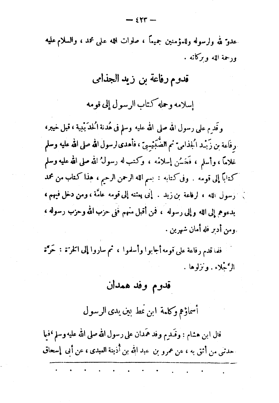 وقدم عَلَى رَسُولِ اللهِ صَلَّى اللَّهُ عَلَيْهِ وَسَلَّمَ فِي هُدْنَةِ الْحُدَيْبِيَةِ، قَبْلَ خَيْبَرَ، رِفَاعَةُ بْنُ زَيْدٍ الْجُذَامِيّ ثُمّ الضّبَيْبِيّ، فَأَهْدَى لِرَسُولِ اللهِ صَلَّى اللَّهُ عَلَيْهِ وَسَلَّمَ غُلَامًا، وَأَسْلَمَ، فَحَسُنَ إسْلَامُهُ، وَكَتَبَ لَهُ رَسُولُ اللهِ صَلّى اللهُ عَلَيْهِ وَسَلّمَ كِتَابًا إلَى قَوْمِهِ. وَفِي كِتَابِهِ: بِسْمِ اللهِ الرّحْمَنِ الرّحِيمِ، هَذَا كِتَابٌ مِنْ مُحَمّدٍ رَسُولِ اللهِ، لِرِفَاعَةِ بْنِ زَيْدٍ. إنّي بَعَثْته إلَى قَوْمِهِ عَامّةً، وَمَنْ دَخَلَ فِيهِمْ، يَدْعُوهُمْ إلَى اللهِ وَإِلَى رَسُولِهِ، فَمَنْ أَقْبَلَ مِنْهُمْ فَفِي حِزْبِ اللهِ وَحِزْبِ رَسُولِهِ، وَمَنْ أَدْبَرَ فَلَهُ أَمَانُ شَهْرَيْنِ.