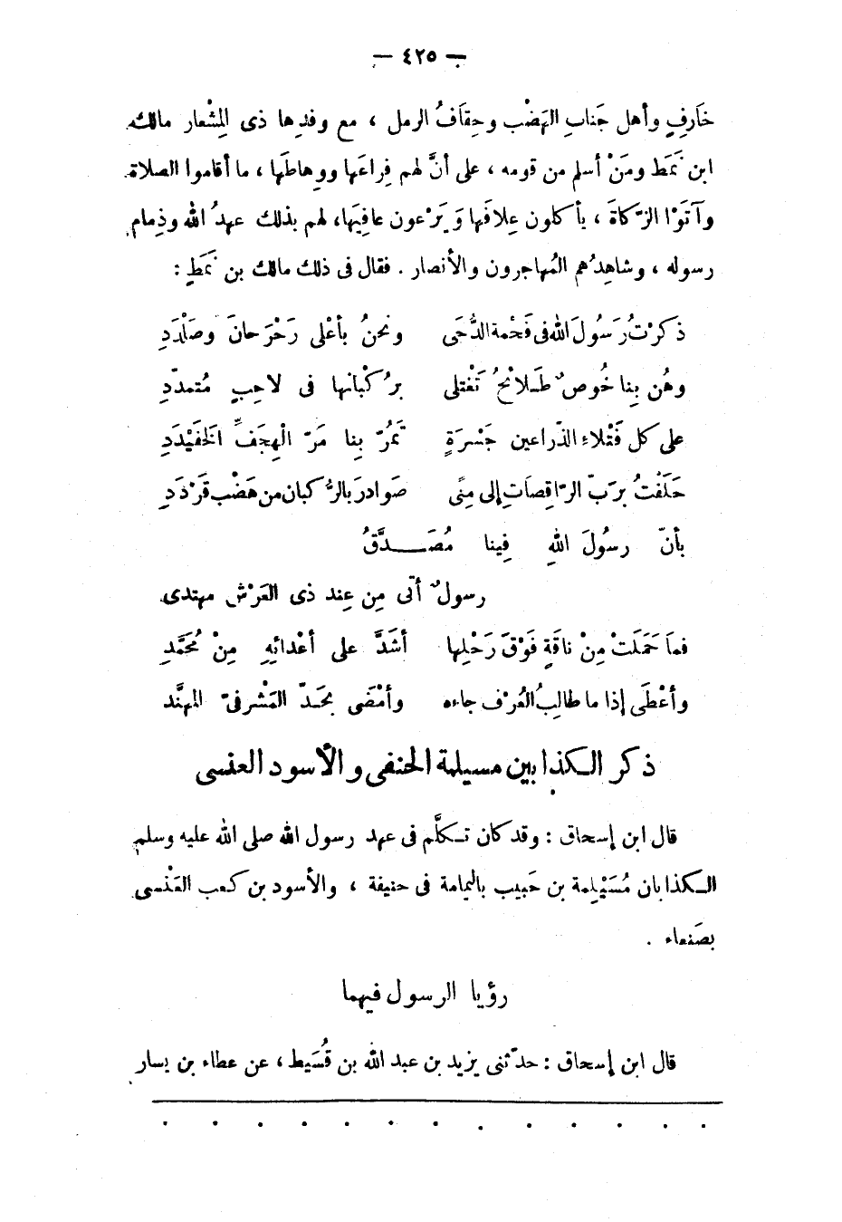 قَالَ ابْنُ إسْحَاقَ: وَقَدْ كَانَ تَكَلّمَ فِي عَهْدِ رَسُولِ اللهِ صَلَّى اللَّهُ عَلَيْهِ وَسَلّمَ الْكَذّابَانِ مسيلمة بن حبيب باليمامة فى حنيفة، والأسود بن كعب العنسى بصنعاء.