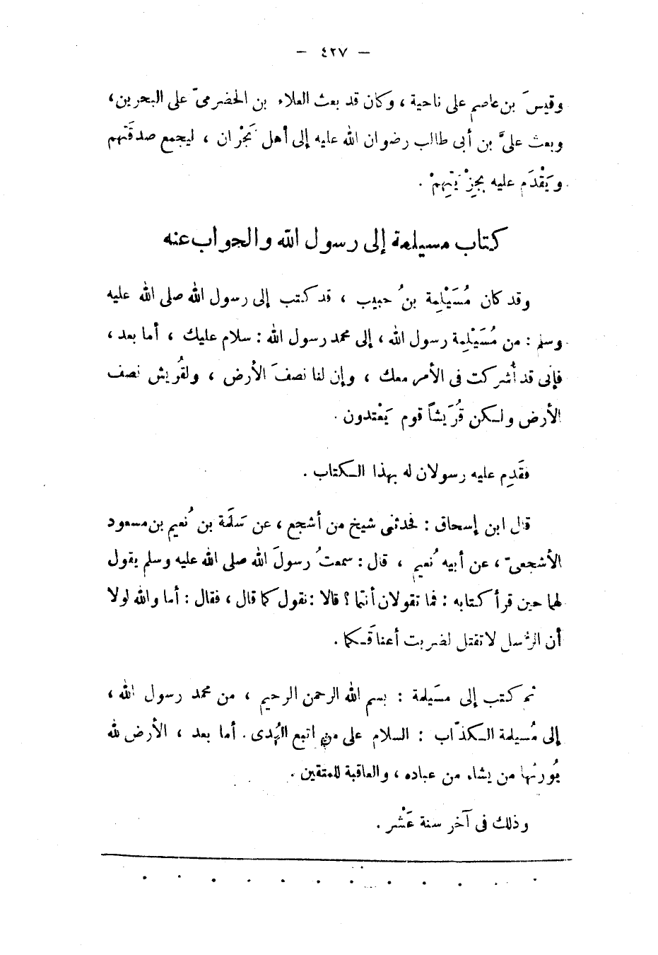 ثُمّ كَتَبَ إلَى مُسَيْلِمَةَ: بِسْمِ اللهِ الرّحْمَنِ الرّحِيمِ، مِنْ مُحَمّدٍ رَسُولِ اللهِ، إلَى مُسَيْلِمَةَ الْكَذّابِ: السّلَامُ على من اتبع الهدى. أما بعد، الْأَرْضَ لِلّهِ يُورَثُهَا مَنْ يُشَاءُ مِنْ عِبَادِهِ، والعاقبة للمتقين.