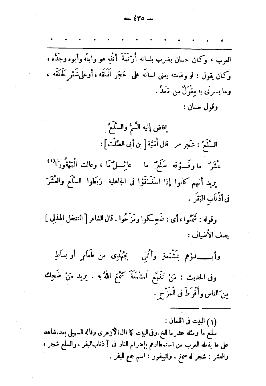(1) البيت فى اللسان: سلع ما ومثله عشر ما الخ. وفى البيت كما قال الأزهرى وقاله السهيلى بعد، شاهد على ما يفعله العرب من استمطارهم بإضرام النار فى آذناب البقر، والسلع شجر، والعشر: شجر له صمغ. والبيقور: اسم جمع للبقر.