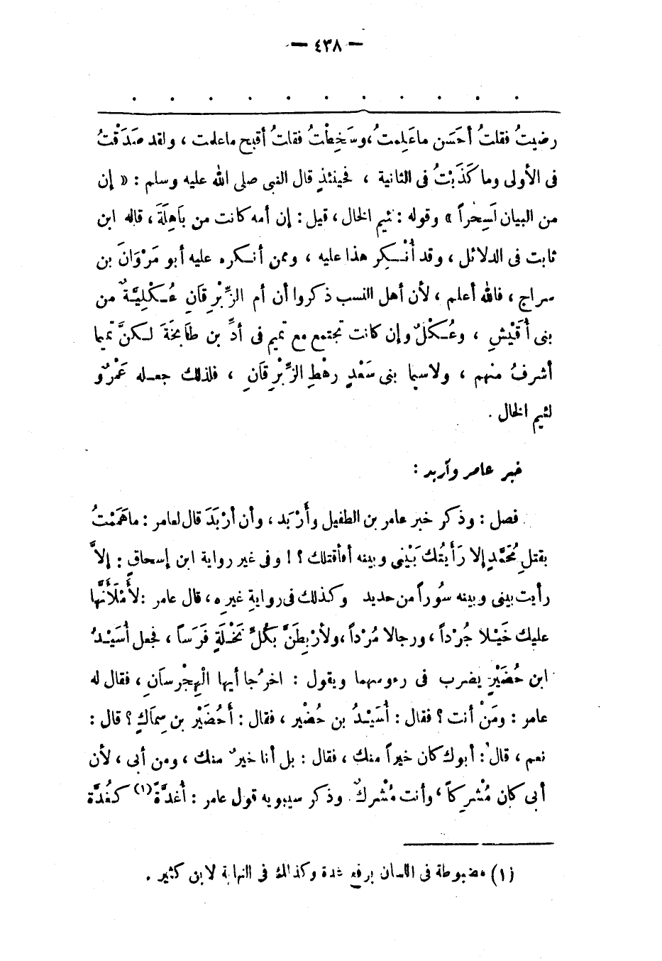 فَصْلٌ: وَذَكَرَ خَبَرَ عَامِرِ بْنِ الطّفَيْلِ وَأَرْبَدَ، وَأَنّ أَرْبَدَ قَالَ لِعَامِرٍ: مَا هَمَمْت بِقَتْلِ مُحَمّدٍ إلّا رَأَيْتُك بَيْنِي وَبَيْنَهُ أَفَأَقْتُلُك؟! وَفِي غَيْرِ رِوَايَةِ ابْنِ إسْحَاقَ: إلّا رَأَيْت بَيْنِي وَبَيْنَهُ سُورًا مِنْ حَدِيدٍ وَكَذَلِك فِي رِوَايَةِ غَيْرِهِ، قَالَ عَامِرٌ: لَأَمْلَأَنّهَا عَلَيْك خَيْلًا جُرْدًا، وَرِجَالًا مُرْدًا، وَلَأَرْبِطَنّ بكلّ نخلة فرسا، فجعل أسيد ابن حضير يضرب فى رؤسهما وَيَقُولُ: اُخْرُجَا أَيّهَا الْهِجْرِسَانِ، فَقَالَ لَهُ عَامِرٌ: وَمَنْ أَنْتَ؟ فَقَالَ: أُسَيْدُ بْنُ حُضَيْرٍ، فَقَالَ: أَحُضَيْرُ بْنُ سِمَاكٍ؟ قَالَ: