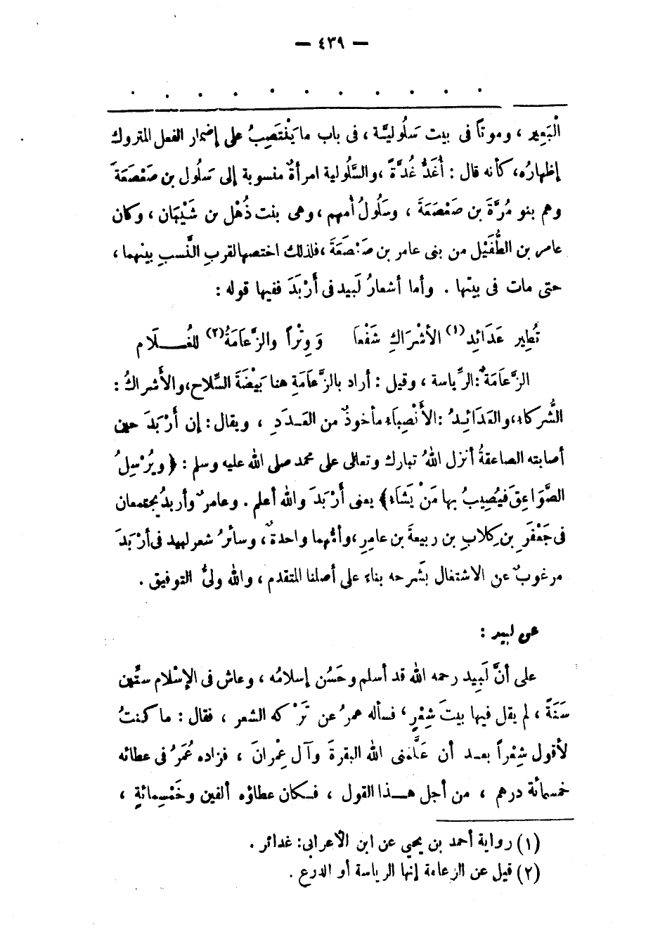 على أنّ لبيد رَحِمَهُ اللهُ قَدْ أَسْلَمَ وَحَسُنَ إسْلَامُهُ، وَعَاشَ فِي الْإِسْلَامِ سِتّينَ سَنَةً، لَمْ يَقُلْ فِيهَا بَيْتَ شِعْرٍ، فَسَأَلَهُ عُمَرُ عَنْ تَرْكِهِ الشّعْرَ، فَقَالَ: مَا كُنْت لِأَقُولَ شِعْرًا بَعْدَ أَنْ علّمنى لله الْبَقَرَةَ وَآلَ عِمْرَانَ، فَزَادَهُ عُمَرُ فِي عَطَائِهِ خَمْسَمِائَةِ دِرْهَمٍ، مِنْ أَجْلِ هَذَا الْقَوْلِ، فَكَانَ عطاؤه ألفين وخمسمائة،