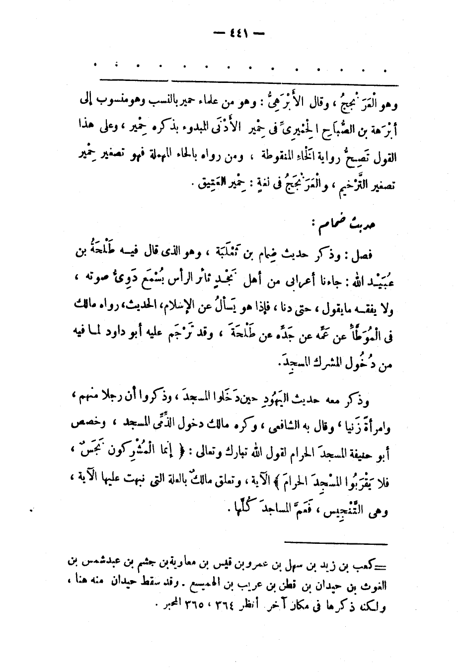 فَصْلٌ: وَذَكَرَ حَدِيثَ ضِمَامِ بْنِ ثَعْلَبَةَ، وَهُوَ الّذِي قَالَ فِيهِ طَلْحَةُ بْنُ عُبَيْدِ اللهِ: جَاءَنَا أَعْرَابِيّ مِنْ أَهْلِ نَجْدٍ ثَائِرَ الرّأْسِ يُسْمَعُ دَوِيّ صَوْتِهِ، وَلَا يُفْقَهُ مَا يَقُولُ، حَتّى دَنَا، فَإِذَا هُوَ يَسْأَلُ عَنْ الْإِسْلَامِ، الْحَدِيثَ، رَوَاهُ مَالِكٌ فِي الْمُوَطّإِ عَنْ عَمّهِ عَنْ جَدّهِ عَنْ طَلْحَةَ، وَقَدْ تَرْجَمَ عَلَيْهِ أَبُو دَاوُدَ لِمَا فِيهِ مِنْ دُخُولِ الْمُشْرِكِ الْمَسْجِدَ.