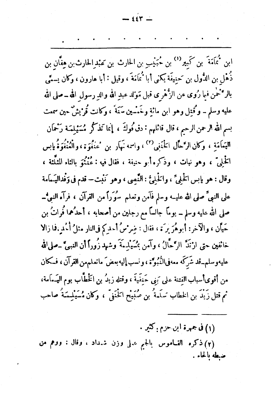ابن ثُمَامَةَ بْنِ كَبِيرِ «1» بْنِ حَبِيبِ بْنِ الْحَارِثِ بْنِ عَبْدِ الْحَارِثِ بْنِ هِفّانَ بْنِ ذُهْلِ بْنِ الدّوَلِ بْنِ حَنِيفَةَ يُكَنّى أَبَا ثُمَامَةَ، وَقِيلَ: أَبَا هَارُونَ، وكان يُسَمّى بِالرّحْمَنِ فِيمَا رُوِيَ عَنْ الزّهْرِيّ قَبْلَ مَوْلِدِ عَبْدِ اللهِ والد رَسُولِ اللهِ- صَلّى اللهُ عَلَيْهِ وَسَلّمَ- وَقُتِلَ وَهُوَ ابْنُ مِائَةٍ وَخَمْسِينَ سَنَةً، وَكَانَتْ قُرَيْشٌ حِينَ سَمِعَتْ بِسْمِ اللهِ الرّحْمَنِ الرّحِيمِ، قَالَ قَائِلُهُمْ: دُقّ فُوك، إنّمَا تَذْكُرُ مُسَيْلِمَةَ رَحْمَانَ الْيَمَامَةِ، وَكَانَ الرّحّالُ الْحَنَفِيّ «2» ، وَاسْمُهُ نَهَارُ بْنُ عُنْفُوَةَ، وَالْعُنْفُوَةُ يَابِسُ الْحَلِيّ، وَهُوَ نَبَاتٌ، وَذَكَرَهُ أَبُو حَنِيفَةَ، فَقَالَ فِيهِ: عُنْثُوَ بِالثّاءِ الْمُثَلّثَةِ، وَقَالَ: هُوَ يَابِسُ الْحَلِيّ، وَالْحَلِيّ: النّصِيّ، وَهُوَ نَبْتٌ- قَدِمَ فِي وَفْدِ الْيَمَامَةِ عَلَى النّبِيّ صَلَّى اللَّهُ عَلَيْهِ وَسَلَّمَ فَآمَنَ وَتَعَلّمَ سُوَرًا مِنْ الْقُرْآنِ، فَرَآهُ النّبِيّ- صَلَّى اللَّهُ عَلَيْهِ وَسَلَّمَ- يَوْمًا جَالِسًا مَعَ رَجُلَيْنِ مِنْ أَصْحَابِهِ، أَحَدُهُمَا فُرَاتُ بْنُ حَيّانَ، وَالْآخَرُ: أَبُو هُرَيْرَةَ، فَقَالَ: ضِرْسُ أَحَدِكُمْ فِي النّارِ مِثْلُ أُحُدٍ، فَمَا زَالَا خَائِفَيْنِ حَتّى ارْتَدّ الرّحّالُ، وَآمَنَ بِمُسَيْلِمَةَ وَشَهِدَ زُورًا أَنّ النّبِيّ- صَلَّى اللَّهُ عَلَيْهِ وَسَلَّمَ- قَدْ شَرِكَهُ مَعَهُ فِي النّبُوّةِ، وَنَسَبَ إلَيْهِ بَعْضَ مَا تَعَلّمَ مِنْ الْقُرْآنِ، فَكَانَ مِنْ أَقْوَى أَسْبَابِ الْفِتْنَةِ عَلَى بنى حنفية، وَقَتَلَهُ زَيْدُ بْنُ الْخَطّابِ يَوْمَ الْيَمَامَةِ، ثُمّ قَتَلَ زَيْدَ بْنَ الْخَطّابِ سَلَمَةُ بْنُ صُبَيْحٍ الحنفىّ، وكان مسيلمة صاحب