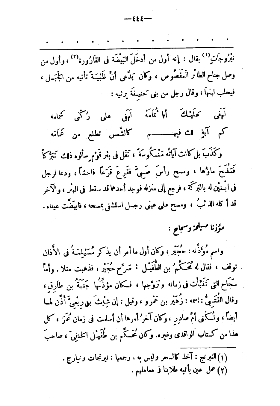 وَاسْمُ مُؤَذّنِهِ: حُجَيْرٌ، وَكَانَ أَوّلَ مَا أُمِرَ أَنْ يَذْكُرَ مُسَيْلِمَةَ فِي الْأَذَانِ تَوَقّفَ، فَقَالَ لَهُ مُحَكّمُ بْنُ الطّفَيْلِ: صَرّحْ حُجَيْرُ، فَذَهَبَتْ مَثَلًا. وَأَمّا سَجَاحُ الّتِي تَنَبّأَتْ فِي زَمَانِهِ وَتَزَوّجَهَا، فَكَانَ مُؤَذّنُهَا جَنَبَةَ بْنَ طَارِقٍ، وَقَالَ الْقُتَبِيّ: اسْمُهُ: زهير بن عمرو، وقيل: إن شبث بنى رِبْعِيّ أَذّنَ لَهَا أَيْضًا، وَتُكَنّى أُمّ صَادِرٍ، وَكَانَ آخِرُ أَمْرِهَا أَنْ أَسْلَمَتْ فِي زَمَانِ عُمَرَ، كُلّ هَذَا مِنْ كِتَابِ الوّاقِدِيّ وَغَيْرِهِ. وكان محكّم بن طفيل الحنفىّ، صاحب