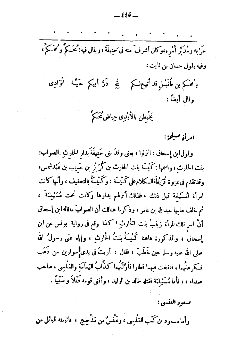 بِنْتُ الحارث، واسمها: كيسة بنت الحارث بن كريز بْنِ حَبِيبِ بْنِ عَبْدِ شَمْسٍ، وَقَدْ تَقَدّمَ فِي غَزْوَةِ قُرَيْظَةَ الْكَلَامُ عَلَى كَيْسَةَ: وَكَيْسَةُ بِالتّخْفِيفِ، وَأَنّهَا كَانَتْ امْرَأَةً لِمُسَيْلِمَةَ قَبْلَ ذَلِكَ، فَلِذَلِكَ أَنْزَلَهُمْ بِدَارِهَا وَكَانَتْ تَحْتَ مُسَيْلِمَةَ، ثُمّ خَلَفَ عَلَيْهَا عَبْدُ اللهِ بْنُ عَامِرٍ، وَذَكَرْنَا هُنَالِكَ أَنّ الصّوَابَ مَا قَالَهُ ابْنُ إسْحَاقَ أَنّ اسْمَ تِلْكَ الْمَرْأَةِ زَيْنَبُ بِنْتُ الْحَارِثِ، كَذَا وَقَعَ فِي رِوَايَةِ يُونُسَ عَنْ ابْنِ إسْحَاقَ، وَالْمَذْكُورَةُ هَاهُنَا كَيْسَةُ بِنْتُ الْحَارِثِ، وَإِيّاهُ عَنَى رَسُولُ اللهِ صَلَّى اللَّهُ عَلَيْهِ وَسَلَّمَ حِينَ خَطَبَ، فَقَالَ: أُرِيت فِي يَدَيّ سِوَارَيْنِ مِنْ ذَهَبٍ فَكَرِهْتهمَا، فَنَفَخْت فِيهِمَا فَطَارَا فَأَوّلْتهمَا كَذّابَ الْيَمَامَةِ وَالْعَنْسِيّ، صَاحِبَ صَنْعَاءَ، فَأَمّا مُسَيْلِمَةُ فَقَتَلَهُ خَالِدُ بْنُ الْوَلِيدِ، وَأَفْنَى قَوْمَهُ قَتْلًا وَسَبْيًا.