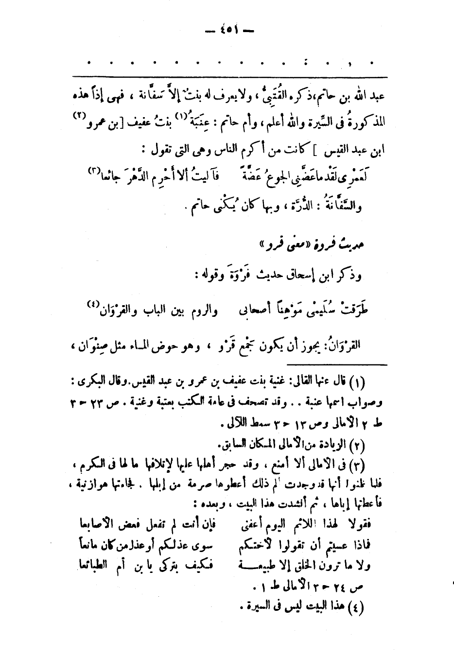 عَبْدِ اللهِ بْنِ حَاتِمٍ، ذَكَرَهُ الْقُتَبِيّ، وَلَا يُعْرَفُ لَهُ بِنْتٌ إلّا سَفّانَةُ، فَهِيَ إذًا هَذِهِ الْمَذْكُورَةُ فِي السّيرَةِ وَاَللهُ أَعْلَمُ، وَأُمّ حاتم: عنبة «1» بنت عفيف [بن عمرو «2» ابن عَبْدِ الْقَيْسِ] كَانَتْ مِنْ أَكْرَمِ النّاسِ وَهِيَ الّتِي تَقُولُ: