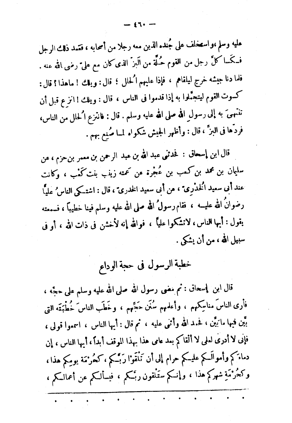 قَالَ ابْنُ إسْحَاقَ: ثُمّ مَضَى رَسُولُ اللهِ صَلّى اللهُ عَلَيْهِ وَسَلّمَ عَلَى حَجّهِ، فَأَرَى النّاسَ مَنَاسِكَهُمْ، وَأَعْلَمَهُمْ سُنَنَ حَجّهِمْ، وَخَطَبَ النّاسَ خُطْبَتَهُ الّتِي بَيّنَ فِيهَا مَا بَيّنَ، فَحَمِدَ اللهَ وَأَثْنَى عَلَيْهِ، ثُمّ قَالَ: أَيّهَا النّاسُ، اسْمَعُوا قَوْلِي، فَإِنّي لَا أَدْرِي لَعَلّي لَا أَلْقَاكُمْ بَعْدَ عَامِي هَذَا بِهَذَا الْمَوْقِفِ أَبَدًا، أَيّهَا النّاسُ، إنّ دِمَاءَكُمْ وَأَمْوَالَكُمْ عَلَيْكُمْ حَرَامٌ إلَى أَنْ تَلْقَوْا رَبّكُمْ، كَحُرْمَةِ يَوْمِكُمْ هَذَا، وَكَحُرْمَةِ شَهْرِكُمْ هَذَا، وَإِنّكُمْ سَتَلْقَوْنَ رَبّكُمْ، فَيَسْأَلُكُمْ عَنْ أَعْمَالِكُمْ،