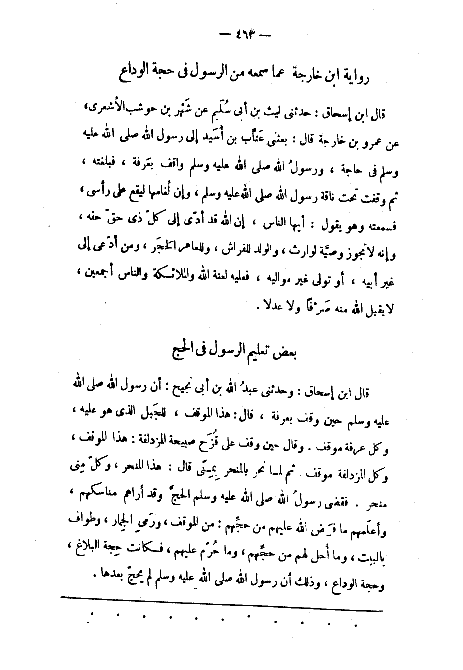 قَالَ ابْنُ إسْحَاقَ: وَحَدّثَنِي عَبْدُ اللهِ بْنُ أَبِي نَجِيحٍ: أن رسول الله صلى الله عليه وسلم حِينَ وَقَفَ بِعَرَفَةَ، قَالَ: هَذَا الْمَوْقِفَ، لِلْجَبَلِ الّذِي هُوَ عَلَيْهِ، وَكُلّ عَرَفَةَ مَوْقِفٌ. وَقَالَ حِينَ وَقَفَ عَلَى قُزَحَ صَبِيحَةَ الْمُزْدَلِفَةِ: هَذَا الْمَوْقِفَ، وَكُلّ الْمُزْدَلِفَةِ مَوْقِفٌ. ثُمّ لَمّا نَحَرَ بالمنحر بمنى قال: هذا المنحر، وَكُلّ مِنًى مَنْحَرٌ. فَقَضَى رَسُولُ اللهِ صَلّى اللهُ عَلَيْهِ وَسَلّمَ الْحَجّ وَقَدْ أَرَاهُمْ مَنَاسِكَهُمْ، وَأَعْلَمَهُمْ مَا فَرَضَ اللهُ عَلَيْهِمْ مِنْ حَجّهِمْ: مِنْ الْمَوْقِفِ، وَرَمْيِ الْجِمَارِ، وَطَوَافٍ بِالْبَيْتِ، وَمَا أُحِلّ لَهُمْ مِنْ حَجّهِمْ، وَمَا حُرّمَ عَلَيْهِمْ، فَكَانَتْ حِجّةَ الْبَلَاغِ، وَحَجّةَ الْوَدَاعِ، وَذَلِكَ أَنّ رَسُولَ اللهِ صَلَّى اللَّهُ عَلَيْهِ وسلم لم يحجّ بعدها.