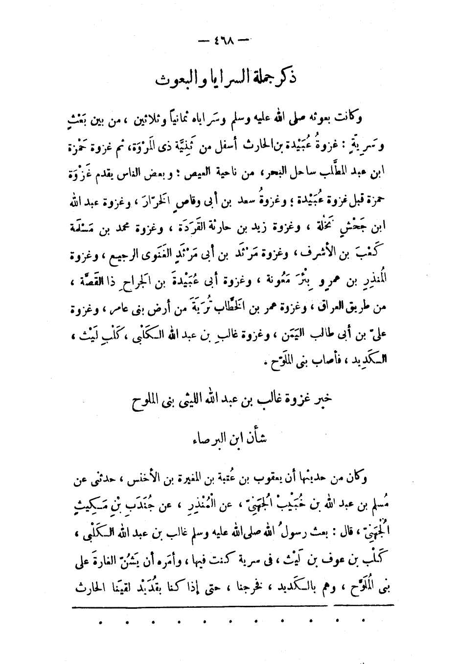 وَكَانَتْ بُعُوثُهُ صَلّى اللهُ عَلَيْهِ وَسَلّمَ وَسَرَايَاهُ ثَمَانِيّا وَثَلَاثِينَ، مِنْ بَيْنَ بَعْثٍ وَسَرِيّةٍ: غَزْوَةُ عُبَيْدَةَ بْنِ الْحَارِثِ أَسْفَلَ مِنْ ثَنِيّةِ ذِي الْمَرْوَةِ، ثُمّ غَزْوَةُ حمزة ابن عبد المطّلب سَاحِلَ الْبَحْرِ، مِنْ نَاحِيَةِ الْعِيصِ؛ وَبَعْضُ النّاسِ يُقَدّمُ غَزْوَةَ حَمْزَةَ قَبْلَ غَزْوَةِ عُبَيْدَةَ؛ وَغَزْوَةُ سَعْدِ بْنِ أَبِي وَقّاصٍ الْخَرّارَ، وَغَزْوَةُ عَبْدِ الله ابن جَحْشٍ نَخْلَةَ، وَغَزْوَةُ زَيْدِ بْنِ حَارِثَةَ الْقَرَدَةَ، وَغَزْوَةُ مُحَمّدِ بْنِ مَسْلَمَةَ كَعْبَ بْنَ الْأَشْرَفِ، وَغَزْوَةُ مَرْثَدِ بْنِ أَبِي مَرْثَدٍ الْغَنَوِيّ الرّجِيعَ، وَغَزْوَةُ الْمُنْذِرِ بْنِ عَمْرٍو بِئْرَ مَعُونَةَ، وَغَزْوَةُ أَبِي عُبَيْدَةَ بْنِ الْجَرّاحِ ذَا الْقَصّةِ، مِنْ طريق العراق، وغزوة عمر بن الخطّاب ترية مِنْ أَرْضِ بَنِي عَامِرٍ، وَغَزْوَةُ عَلِيّ بْنِ أَبِي طَالِبٍ الْيَمَنَ، وَغَزْوَةُ غَالِبِ بْنِ عَبْدِ اللهِ الْكَلْبِيّ، كَلْبِ لَيْثٍ، الْكَدِيدَ، فَأَصَابَ بَنِي الْمُلَوّحِ.