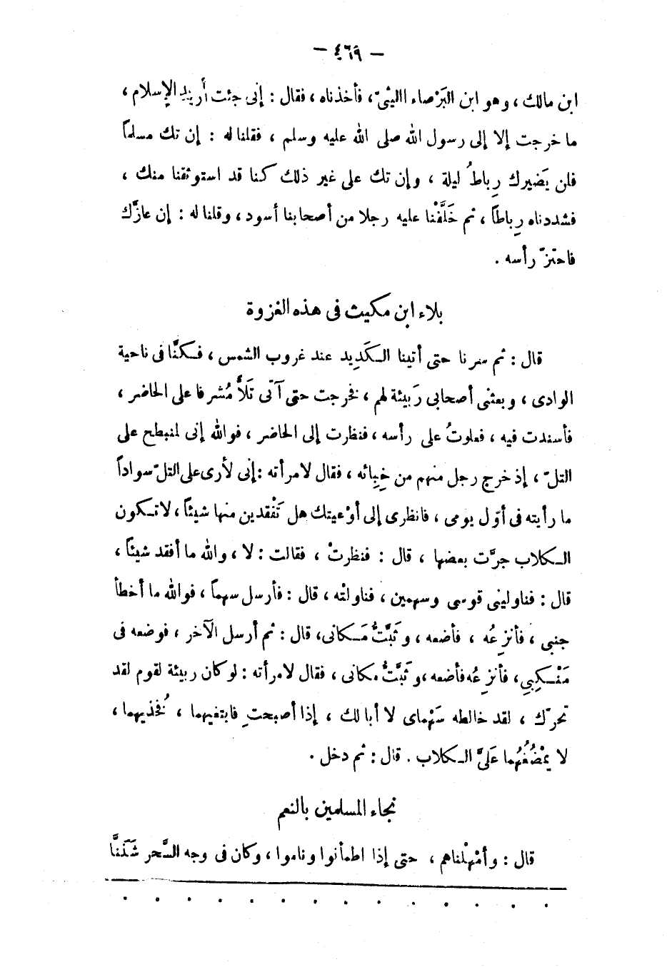 ابن مَالِكٍ، وَهُوَ ابْنُ الْبَرْصَاءِ اللّيْثِيّ، فَأَخَذْنَاهُ، فَقَالَ: إنّي جِئْت أُرِيدُ الْإِسْلَامَ، مَا خَرَجْت إلّا إلَى رَسُولِ اللهِ صَلَّى اللَّهُ عَلَيْهِ وَسَلَّمَ، فَقُلْنَا لَهُ: إنْ تَكُ مُسْلِمًا فَلَنْ يَضِيرُك رِبَاطُ لَيْلَةٍ، وَإِنْ تَكُ عَلَى غَيْرِ ذَلِكَ كُنّا قَدْ اسْتَوْثَقْنَا مِنْك، فَشَدَدْنَاهُ رِبَاطًا، ثُمّ خَلّفْنَا عَلَيْهِ رَجُلًا مِنْ أَصْحَابِنَا أَسْوَدَ، وَقُلْنَا لَهُ: إنْ عَازّك فَاحْتَزّ رَأْسَهُ.