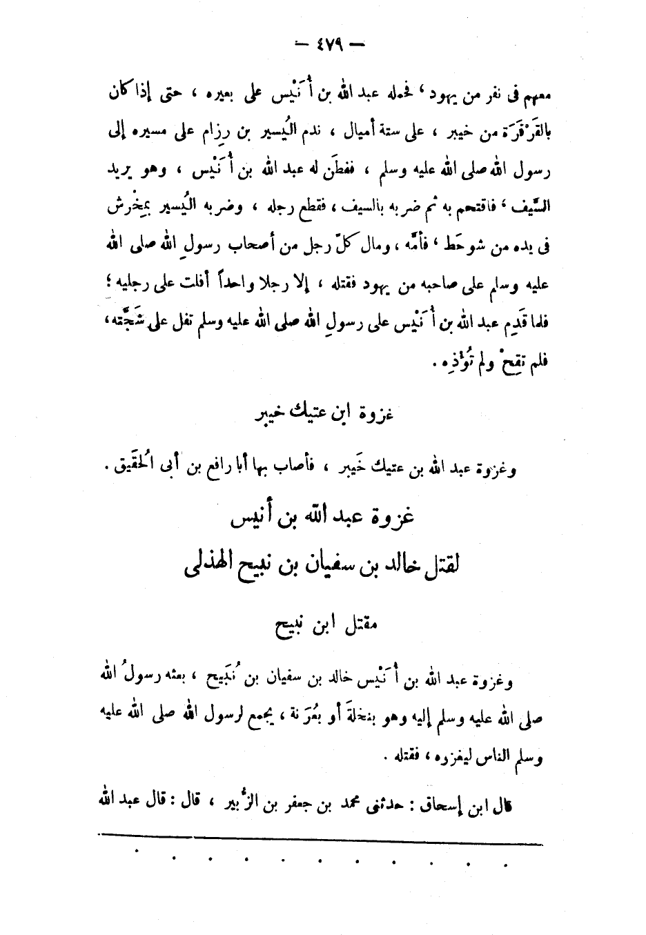 وَغَزْوَةُ عَبْدِ اللهِ بْنِ أُنَيْسٍ خَالِدَ بْنِ سُفْيَانَ بْنِ نُبَيْحٍ، بَعَثَهُ رَسُولُ اللهِ صَلَّى اللَّهُ عَلَيْهِ وَسَلَّمَ إلَيْهِ وَهُوَ بِنَخْلَةَ أَوْ بِعُرَنَةَ، يَجْمَعُ لِرَسُولِ اللهِ صَلّى اللهُ عَلَيْهِ وَسَلّمَ النّاسَ لِيَغْزُوهُ، فَقَتَلَهُ.
