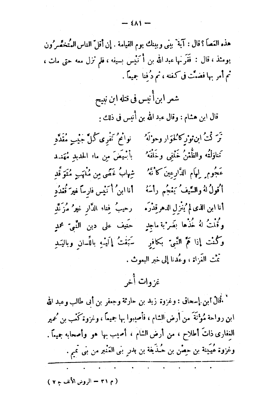 قَالَ ابْنُ هِشَامٍ: وَقَالَ عَبْدُ اللهِ بْنُ أُنَيْسٍ فِي ذلك: