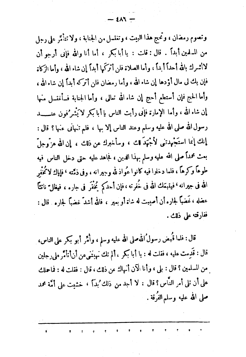 قَالَ: فَلَمّا قُبِضَ رَسُولُ اللهِ صَلَّى اللَّهُ عَلَيْهِ وَسَلَّمَ، وَأُمّرَ أَبُو بَكْرٍ عَلَى النّاسِ، قَالَ: قَدِمْت عَلَيْهِ، فَقُلْت لَهُ: يَا أَبَا بَكْرٍ، أَلَمْ تَكُ نَهَيْتَنِي عَنْ أَنْ أَتَأَمّرَ عَلَى رَجُلَيْنِ مِنْ الْمُسْلِمِينَ؟ قَالَ: بَلَى، وَأَنَا الْآنَ أَنَهَاك عَنْ ذَلِكَ، قَالَ: فَقُلْت لَهُ: فَمَا حَمْلُك عَلَى أَنْ تَلِيَ أَمْرَ النّاسِ؟ قَالَ: لَا أَجِدُ مِنْ ذَلِكَ بُدّا، خَشِيت عَلَى أُمّةِ مُحَمّدٍ صَلّى اللهُ عَلَيْهِ وَسَلّمَ الْفُرْقَةَ.