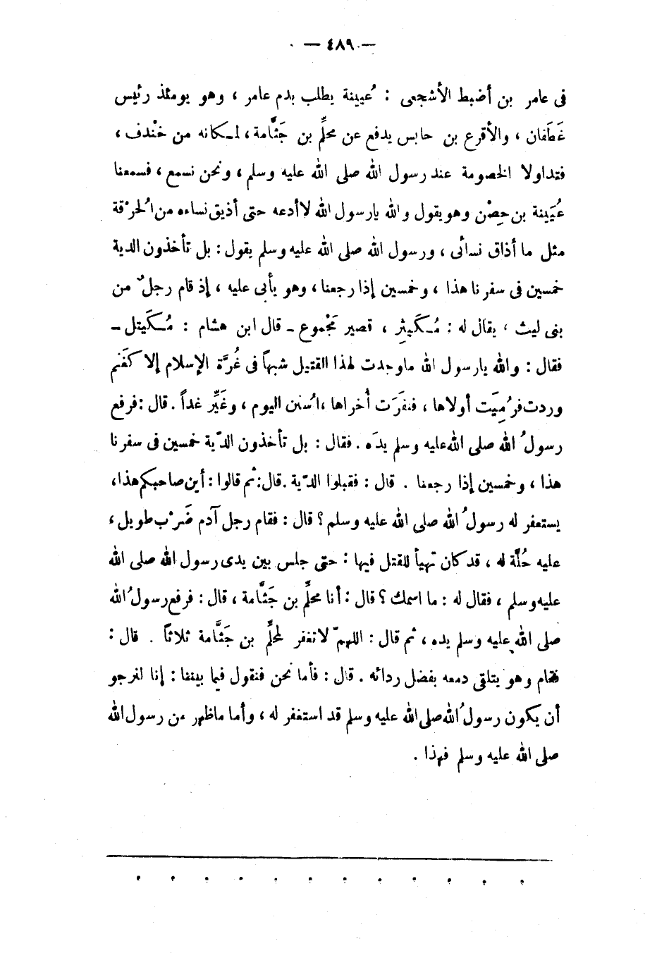 فِي عَامِرِ بْنِ أَضْبَطَ الْأَشْجَعِيّ: عُيَيْنَةُ يَطْلُبُ بِدَمِ عَامِرٍ، وَهُوَ يَوْمئِذٍ رَئِيسُ غَطَفَانَ، وَالْأَقْرَعُ بْنُ حَابِسٍ يَدْفَعُ عَنْ مُحَلّمِ بْنِ جَثّامَةَ، لِمَكَانِهِ مِنْ خندف، فَتَدَاوَلَا الْخُصُومَةَ عِنْدَ رَسُولِ اللهِ صَلّى اللهُ عَلَيْهِ وَسَلّمَ، وَنَحْنُ نَسْمَعُ، فَسَمِعْنَا عُيَيْنَةُ بْنَ حِصْنٍ وَهُوَ يَقُولُ وَاَللهِ يَا رَسُولَ اللهِ لَا أَدْعُهُ حَتّى أُذِيقَ نِسَاءَهُ مِنْ الْحُرْقَةِ مِثْلَ مَا أَذَاقَ نِسَائِي، وَرَسُولُ اللهِ صَلّى اللهُ عَلَيْهِ وَسَلّمَ يَقُولُ: بَلْ تَأْخُذُونَ الدّيَةَ خَمْسِينَ فِي سَفَرِنَا هَذَا، وَخَمْسِينَ إذَا رَجَعْنَا، وَهُوَ يَأْبَى عَلَيْهِ، إذْ قَامَ رَجُلٌ مِنْ بَنِي لَيْثٍ، يُقَالُ لَهُ: مُكَيْثِرٌ، قَصِيرٌ مَجْمُوعٌ- قَالَ ابْنُ هِشَامٍ: مُكَيْتِلٌ- فَقَالَ: وَاَللهِ يَا رَسُولَ اللهِ مَا وَجَدْت لِهَذَا الْقَتِيلِ شَبَهًا فِي غُرّةِ الْإِسْلَامِ إلّا كَغَنَمٍ وَرَدَتْ فَرُمِيَتْ أُولَاهَا، فَنَفَرَتْ أُخْرَاهَا، اُسْنُنْ الْيَوْمَ، وَغَيّرْ غَدًا. قَالَ: فَرَفَعَ رَسُولُ اللهِ صَلّى اللهُ عَلَيْهِ وَسَلّمَ يَدَهُ. فَقَالَ: بَلْ تَأْخُذُونَ الدّيَةَ خَمْسِينَ فِي سَفَرِنَا هَذَا، وَخَمْسِينَ إذَا رَجَعْنَا. قَالَ: فَقَبِلُوا الدّيَةَ. قَالَ: ثُمّ قَالُوا: أَيْنَ صَاحِبُكُمْ هَذَا، يَسْتَغْفِرُ لَهُ رَسُولُ اللهِ صَلّى اللهُ عَلَيْهِ وَسَلّمَ؟ قَالَ: فَقَامَ رَجُلٌ آدَمُ ضَرْبٌ طَوِيلٌ، عَلَيْهِ حُلّةٌ لَهُ، قَدْ كَانَ تَهَيّأَ لِلْقَتْلِ فِيهَا: حَتّى جَلَسَ بَيْنَ يَدَيْ رَسُولِ اللهِ صَلَّى اللَّهُ عَلَيْهِ وَسَلَّمَ، فَقَالَ لَهُ: مَا اسْمُك؟ قَالَ: أَنَا مُحَلّمُ بْنُ جَثّامَةَ، قَالَ: فَرَفَعَ رَسُولُ اللهِ صَلّى اللهُ عَلَيْهِ وَسَلّمَ يَدَهُ، ثُمّ قَالَ: اللهُمّ لَا تَغْفِرْ لِمُحَلّمِ بْنِ جَثّامَةَ ثَلَاثًا. قَالَ: