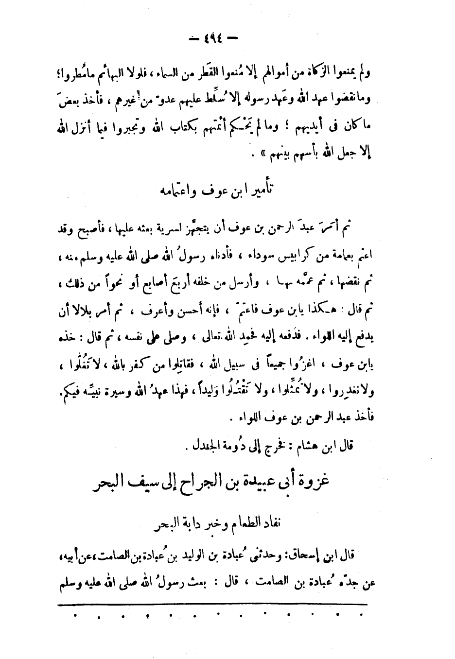 ثم أَمَرَ عَبْدَ الرّحْمَنِ بْنَ عَوْفٍ أَنْ يَتَجَهّزَ لِسَرِيّةِ بَعَثَهُ عَلَيْهَا، فَأَصْبَحَ وَقَدْ اعْتَمّ بِعِمَامَةِ مِنْ كَرَابِيسَ سَوْدَاءَ، فَأَدْنَاهُ رَسُولُ اللهِ صَلّى اللهُ عَلَيْهِ وَسَلّمَ مِنْهُ، ثُمّ نَقَضَهَا، ثُمّ عَمّمَهُ بِهَا، وَأَرْسَلَ مِنْ خَلْفِهِ أَرْبَعَ أَصَابِعَ أَوْ نَحْوًا مِنْ ذَلِكَ، ثُمّ قَالَ: هَكَذَا يا بن عَوْفٍ فَاعْتَمّ، فَإِنّهُ أَحْسَنُ وَأَعْرَفُ، ثُمّ أَمَرَ بَلَالًا أَنْ يَدْفَعَ إلَيْهِ اللّوَاءَ. فَدَفَعَهُ إلَيْهِ فَحَمِدَ اللهَ تَعَالَى، وَصَلّى عَلَى نَفْسِهِ، ثُمّ قَالَ: خُذْهُ يَا بْنَ عَوْفٍ، اُغْزُوَا جَمِيعًا فِي سَبِيلِ اللهِ، فَقَاتِلُوا مَنْ كَفَرَ بِاَللهِ، لَا تَغُلّوا، وَلَا تَغْدِرُوا، وَلَا تُمَثّلُوا، وَلَا تَقْتُلُوا وَلَيَدًا، فَهَذَا عَهْدُ اللهِ وَسِيرَةُ نَبِيّهِ فِيكُمْ.
