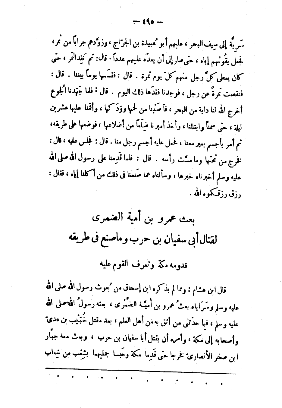 قَالَ ابْنُ هِشَامٍ: وَمِمّا لَمْ يَذْكُرْهُ ابْنُ إسْحَاقَ مِنْ بُعُوثِ رَسُولِ اللهِ صَلّى اللهُ عَلَيْهِ وَسَلّمَ وَسَرَايَاهُ بَعْثُ عَمْرِو بْنِ أُمَيّةَ الضّمْرِيّ، بَعَثَهُ رَسُولُ اللهِ صَلَّى اللَّهُ عَلَيْهِ وَسَلَّمَ، فِيمَا حَدّثَنِي مَنْ أَثِقُ بِهِ مِنْ أَهْلِ الْعِلْمِ، بَعْدَ مَقْتَلِ خُبَيْبِ بْنِ عَدِيّ وَأَصْحَابِهِ إلَى مَكّةَ، وَأَمَرَهُ أَنْ يَقْتُلَ أَبَا سفيان بن حرب، وبعث معه جبّار ابن صَخْرٍ الْأَنْصَارِيّ فَخَرَجَا حَتّى قَدِمَا مَكّةَ وَحَبَسَا جَمَلَيْهِمَا بِشِعْبٍ مِنْ شِعَابِ