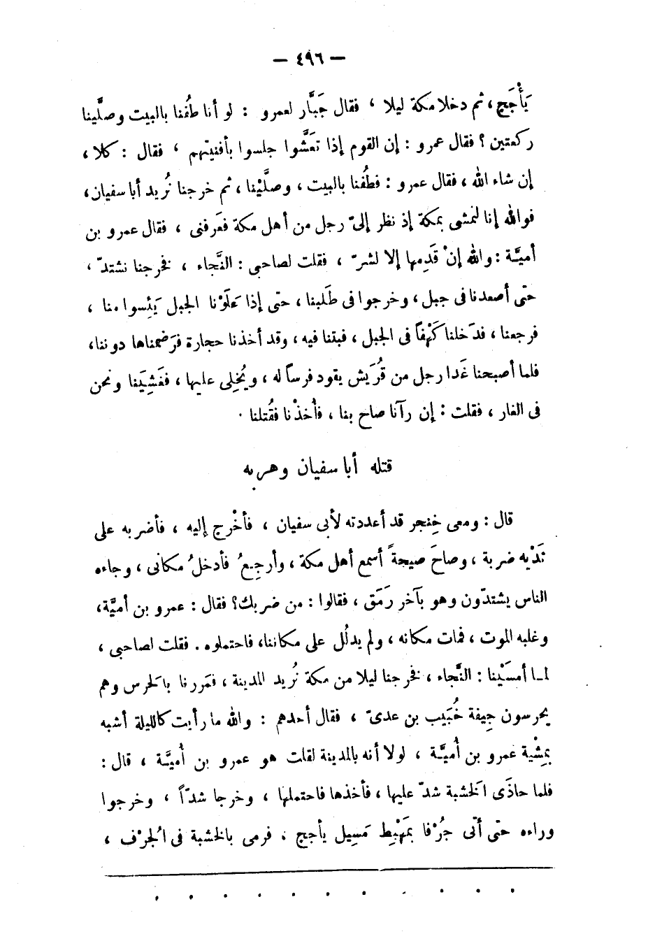 قَالَ: وَمَعِي خِنْجَرٌ قَدْ أَعْدَدْته لِأَبِي سُفْيَانَ، فَأَخْرُجُ إلَيْهِ، فَأَضْرِبُهُ عَلَى ثَدْيِهِ ضَرْبَةً، وَصَاحَ صَيْحَةً أَسْمَعَ أَهْلَ مَكّةَ، وَأَرْجِعُ فَأَدْخُلُ مَكَانِي، وَجَاءَهُ النّاسُ يَشْتَدّونَ وَهُوَ بِآخِرِ رَمَقٍ، فَقَالُوا: مَنْ ضَرَبَك؟ فَقَالَ: عَمْرُو بْنُ أُمَيّةَ، وَغَلَبَهُ الْمَوْتُ، فَمَاتَ مَكَانَهُ، وَلَمْ يَدْلُلْ عَلَى مَكَانِنَا، فَاحْتَمَلُوهُ. فَقُلْت لِصَاحِبِي، لَمّا أَمْسَيْنَا: النّجَاءُ، فَخَرَجْنَا لَيْلًا مِنْ مَكّةَ نُرِيدُ الْمَدِينَةَ، فَمَرَرْنَا بِالْحَرَسِ وَهُمْ يَحْرَسُونَ جِيفَةَ خُبَيْبِ بْنِ عَدِيّ، فَقَالَ أَحَدُهُمْ: وَاَللهِ مَا رَأَيْت كَاللّيْلَةِ أَشَبَهَ بِمِشْيَةِ عَمْرِو بْنِ أُمَيّةَ، لَوْلَا أَنّهُ بِالْمَدِينَةِ لَقُلْت هُوَ عَمْرُو بْنُ أُمَيّةَ، قَالَ: