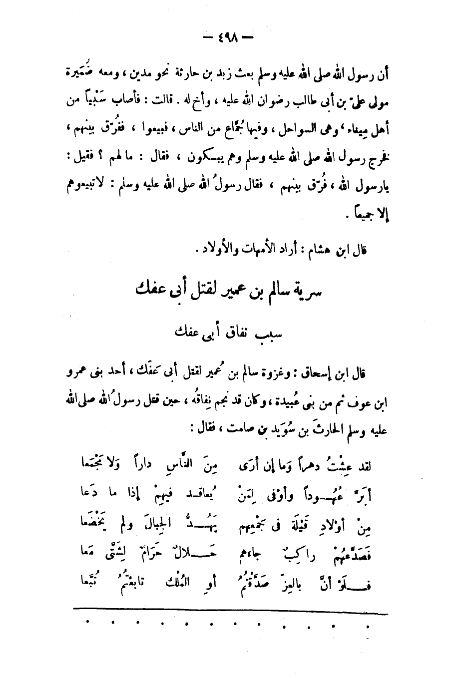 قَالَ ابْنُ إسْحَاقَ: وَغَزْوَةُ سَالِمِ بْنِ عُمَيْرٍ لِقَتْلِ أبى عفك، أحد بنى عمرو ابن عوف ثُمّ مِنْ بَنِي عُبَيْدَةَ، وَكَانَ قَدْ نَجَمَ نِفَاقُهُ، حِينَ قَتْلَ رَسُولِ اللهِ صَلَّى اللَّهُ عَلَيْهِ وَسَلَّمَ الْحَارِثَ بْنَ سُوَيْد بْنِ صَامِتٍ، فَقَالَ:
