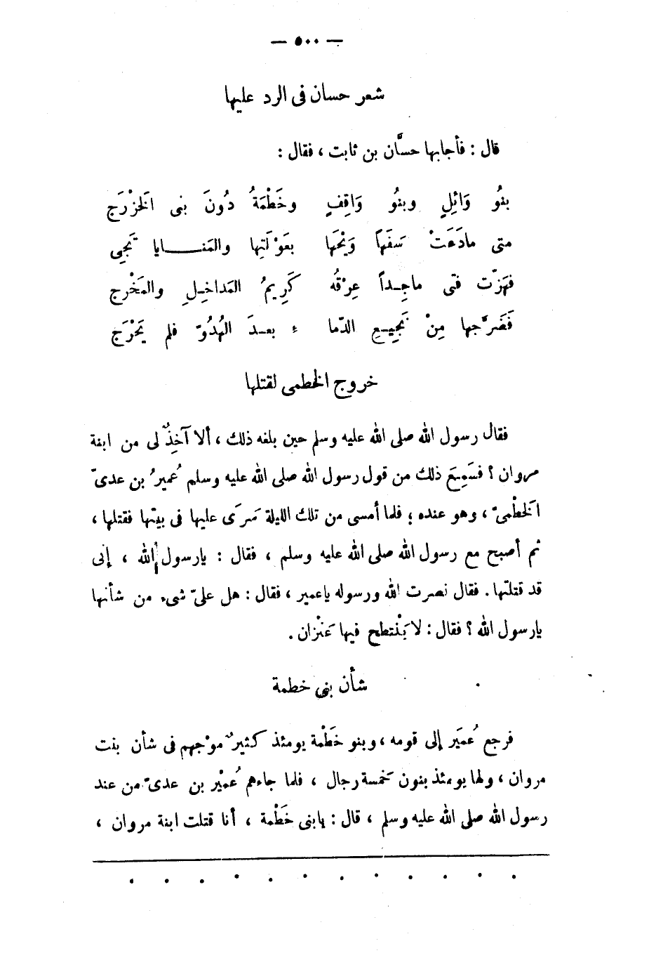 فَقَالَ رَسُولُ اللهِ صَلَّى اللَّهُ عَلَيْهِ وَسَلَّمَ حِينَ بَلَغَهُ ذَلِكَ، أَلَا آخِذٌ لِي مِنْ ابْنَةِ مَرْوَانَ؟ فَسَمِعَ ذَلِكَ مِنْ قَوْلِ رَسُولِ اللهِ صَلّى اللهُ عَلَيْهِ وَسَلّمَ عُمَيْرُ بْنُ عَدِيّ الْخِطْمِيّ، وَهُوَ عِنْدَهُ؛ فَلَمّا أَمْسَى مِنْ تِلْكَ اللّيْلَةِ سَرَى عَلَيْهَا فِي بَيْتِهَا فَقَتَلَهَا، ثُمّ أَصْبَحَ مَعَ رَسُولِ اللهِ صَلَّى اللَّهُ عَلَيْهِ وَسَلَّمَ، فقال: يا رَسُولَ اللهِ، إنّي قَدْ قَتَلْتهَا. فَقَالَ نَصَرْت اللهَ وَرَسُولَهُ يَا عُمَيْرُ، فَقَالَ: هَلْ عَلَيّ شَيْءٌ مِنْ شَأْنِهَا يَا رَسُولَ اللهِ؟ فَقَالَ: لَا يَنْتَطِحُ فِيهَا عَنْزَانِ.