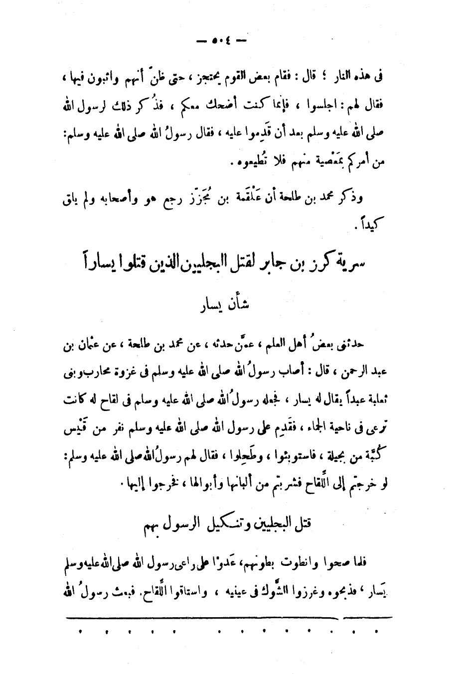 حَدّثَنِي بَعْضُ أَهْلِ الْعِلْمِ، عَمّنْ حَدّثَهُ، عَنْ مُحَمّدِ بْنِ طَلْحَةَ، عَنْ عُثْمَانَ بْنِ عَبْدِ الرّحْمَنِ، قَالَ: أَصَابَ رَسُولُ اللهِ صَلّى اللهُ عَلَيْهِ وَسَلّمَ فِي غَزْوَةِ مُحَارَبٍ وَبَنِيّ ثَعْلَبَةَ عَبْدًا يُقَالُ لَهُ يَسَارٌ، فَجَعَلَهُ رَسُولُ اللهِ صَلّى اللهُ عَلَيْهِ وَسَلّمَ فِي لِقَاحٍ لَهُ كانت ترعى فى نَاحِيَةِ الْجَمّاءِ، فَقَدِمَ عَلَى رَسُولِ اللهِ صَلَّى اللَّهُ عَلَيْهِ وَسَلَّمَ نَفَرٌ مِنْ قَيْسٍ كُبّة مِنْ بَجِيلَةَ، فَاسْتَوْبَئُوا، وَطَحِلُوا، فَقَالَ لَهُمْ رَسُولُ اللهِ صَلَّى اللَّهُ عَلَيْهِ وَسَلَّمَ: