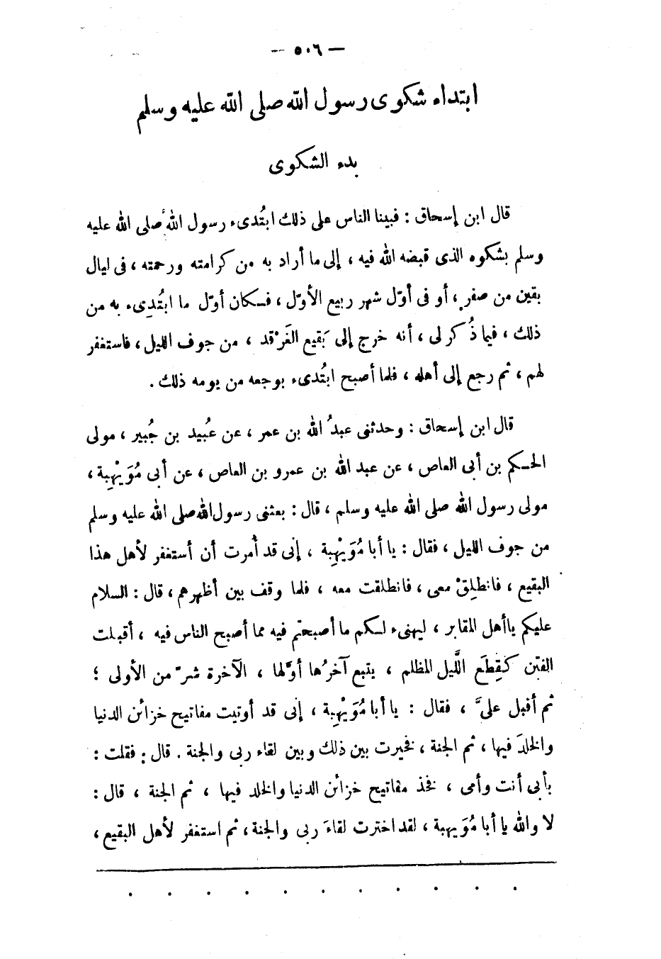 قَالَ ابْنُ إسْحَاقَ: وَحَدّثَنِي عَبْدُ اللهِ بْنُ عُمَرَ، عَنْ عُبَيْدِ بْنِ جُبَيْرٍ، مَوْلَى الْحَكَمِ بْنِ أَبِي الْعَاصِ، عَنْ عَبْدِ اللهِ بْنِ عَمْرِو بْنِ الْعَاصِ، عَنْ أَبِي مُوَيْهِبَةَ، مَوْلَى رَسُولِ اللهِ صَلَّى اللَّهُ عَلَيْهِ وَسَلَّمَ، قَالَ: بَعَثَنِي رَسُولُ اللهِ صَلَّى اللَّهُ عَلَيْهِ وَسَلَّمَ مِنْ جَوْفِ اللّيْلِ، فَقَالَ: يَا أَبَا مُوَيْهِبَةَ، إنّي قَدْ أُمِرْت أَنْ أَسْتَغْفِرَ لِأَهْلِ هَذَا الْبَقِيعِ، فَانْطَلِقْ مَعِي، فَانْطَلَقْت مَعَهُ، فَلَمّا وَقَفَ بَيْنَ أَظْهُرِهِمْ، قال: السلام عليكم يا أهل الْمَقَابِرِ، لِيَهْنِئَ لَكُمْ مَا أَصْبَحْتُمْ فِيهِ مِمّا أَصْبَحَ النّاسُ فِيهِ، أَقْبَلَتْ الْفِتَنُ كَقِطَعِ اللّيْلِ الْمُظْلِمِ، يَتْبَعُ آخِرُهَا أَوّلَهَا، الْآخِرَةُ شَرّ مِنْ الْأُولَى؛ ثُمّ أَقْبَلَ عَلَيّ، فَقَالَ: يَا أَبَا مُوَيْهِبَةَ، إنّي قَدْ أُوتِيت مَفَاتِيحَ خَزَائِنِ الدّنْيَا وَالْخُلْدَ فِيهَا، ثُمّ الْجَنّةُ، فَخُيّرْت بَيْنَ ذَلِكَ وَبَيْنَ لِقَاءِ رَبّي وَالْجَنّةِ. قَالَ: فَقُلْت: