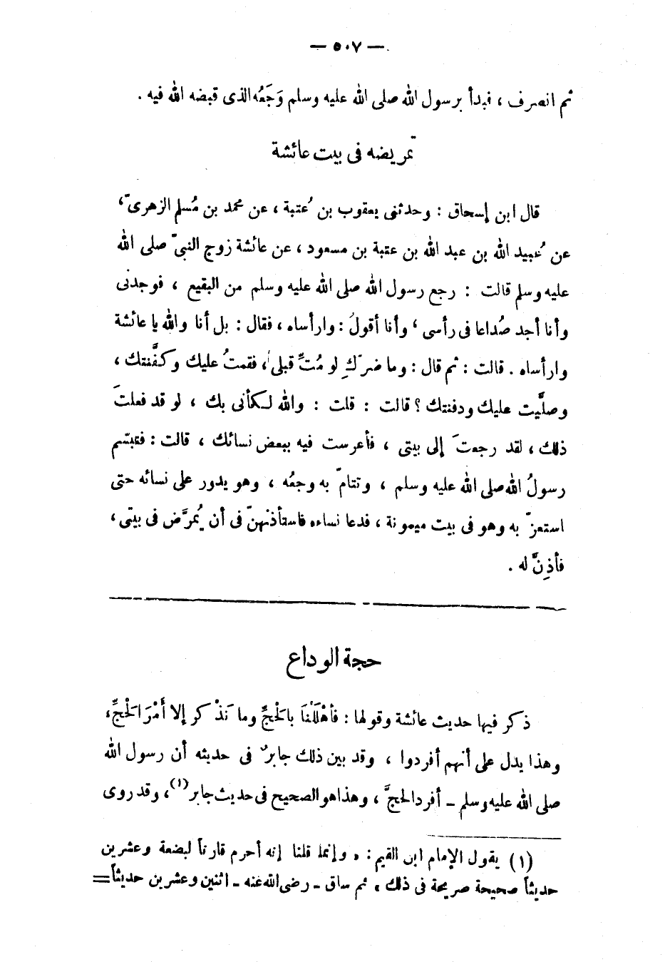حَجّةُ الْوَدَاعِ ذَكَرَ فِيهَا حَدِيثَ عَائِشَةَ وَقَوْلَهَا: فَأَهْلَلْنَا بِالْحَجّ وَمَا نَذْكُرُ إلّا أَمْرَ الْحَجّ، وَهَذَا يَدُلّ عَلَى أَنّهُمْ أَفْرَدُوا، وَقَدْ بَيّنَ ذَلِكَ جَابِرٌ فِي حَدِيثِهِ أَنّ رَسُولَ اللهِ صَلَّى اللَّهُ عَلَيْهِ وَسَلَّمَ- أَفْرَدَ الْحَجّ، وَهَذَا هُوَ الصّحِيحُ فِي حَدِيثِ جَابِرٍ «1» ، وَقَدْ رُوِيَ