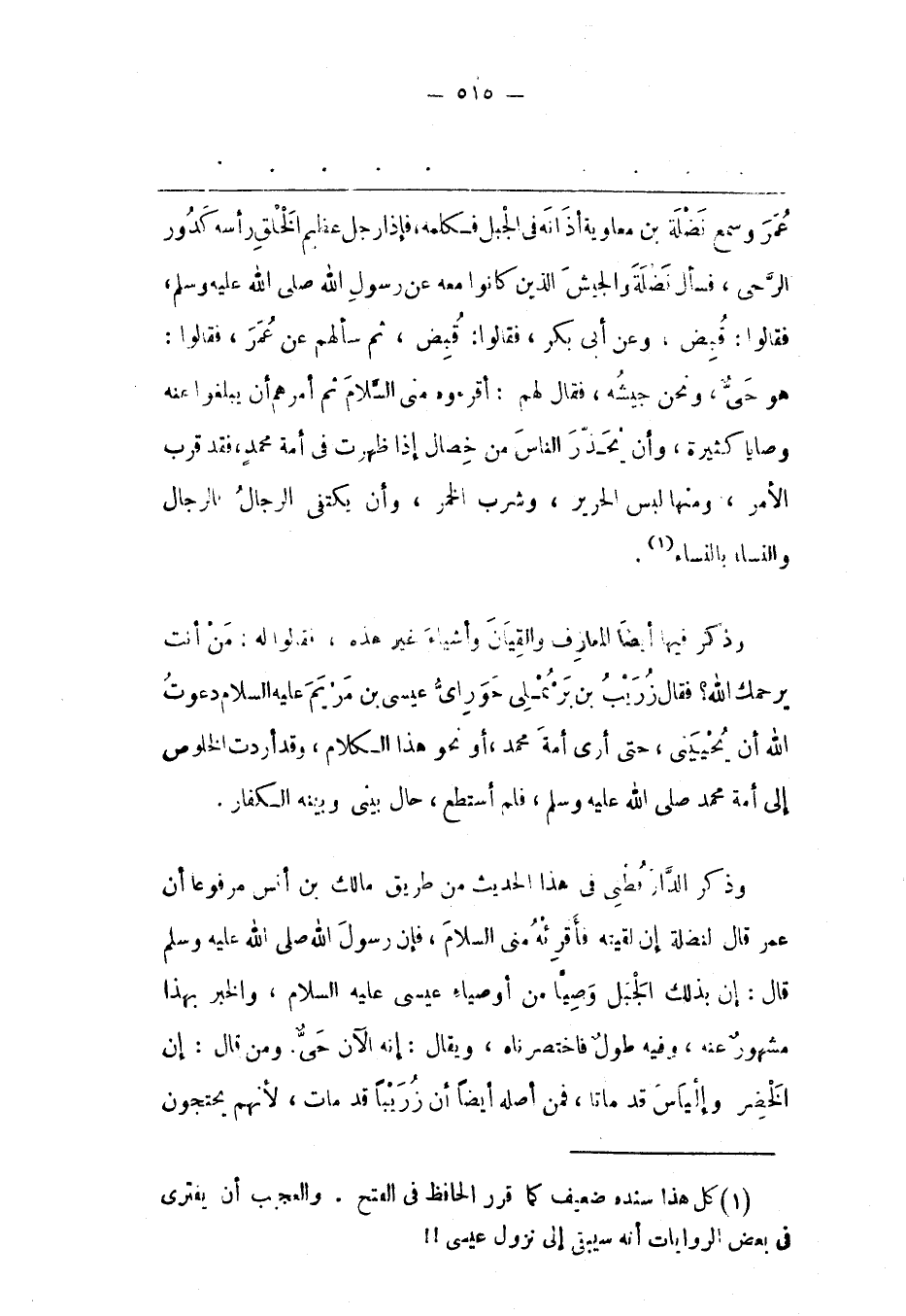 (1) كل هذا سنده ضعيف كما قرر الحافظ فى الفتح. والعجب أن يفترى فى بعض الروايات أنه سيبقى إلى نزول عيسى!!