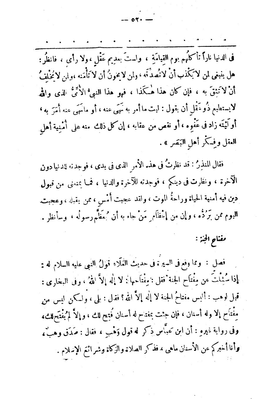 قبل لِوَهْبٍ: أَلَيْسَ مِفْتَاحُ الْجَنّةِ لَا إلَهَ إلّا اللهُ؟ فَقَالَ: بَلَى، وَلَكِنْ لَيْسَ مِنْ مِفْتَاحٍ إلّا وَلَهُ أَسْنَانٌ، فَإِنْ جِئْت بِمِفْتَاحٍ لَهُ أَسْنَانٌ فُتِحَ لَك، وَإِلّا لَمْ يُفْتَحْ لَك، وَفِي رِوَايَةِ غَيْرِهِ: أَنّ ابْنَ عَبّاسٍ ذُكِرَ لَهُ قَوْلُ وَهْبٍ، فَقَالَ: صَدَقَ وَهْبٌ، وَأَنَا أُخْبِرُكُمْ عَنْ الْأَسْنَانِ مَا هِيَ، فَذَكَرَ الصّلَاةَ وَالزّكَاةَ وَشَرَائِعَ الْإِسْلَامِ.