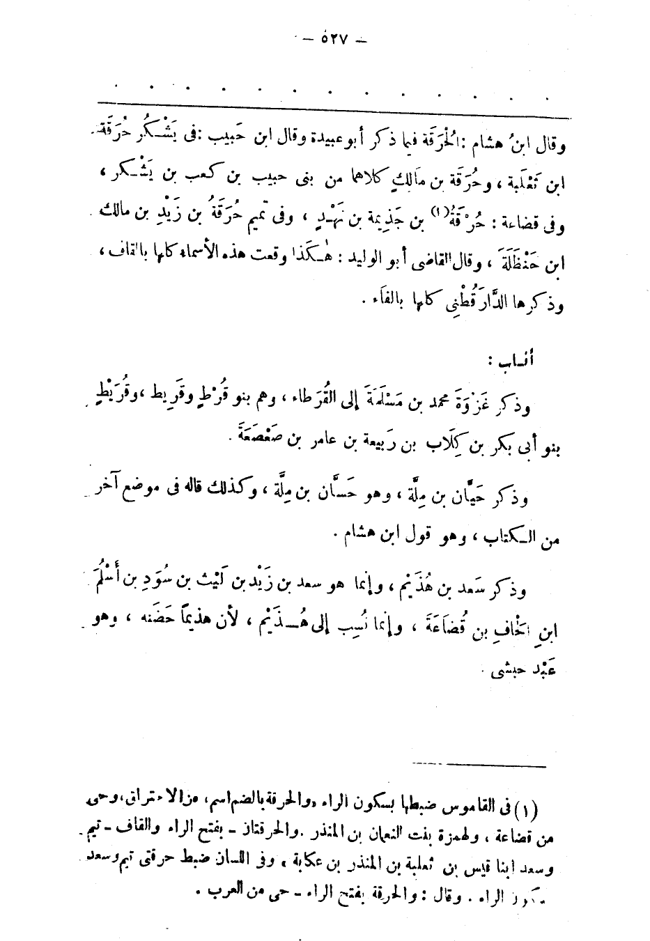 وَقَالَ ابْنُ هِشَامٍ: الْحُرْقَةُ فِيمَا ذَكَرَ أَبُو عُبَيْدَةَ وَقَالَ ابْنُ حَبِيبٍ: فِي يَشْكُرَ حُرَقَةُ ابن ثَعْلَبَةَ، وَحُرْقَةُ بْنُ مَالِكٍ كِلَاهُمَا مِنْ بَنِي حَبِيبِ بْنِ كَعْبِ بْنِ يَشْكُرَ، وَفِي قُضَاعَةَ: حُرْقَةُ «1» بْنُ جَذِيمَةَ بْنِ نَهْدٍ، وَفِي تَمِيمٍ حرقة بن زيد بن مالك ابن حَنْظَلَةَ، وَقَالَ الْقَاضِي أَبُو الْوَلِيدِ: هَكَذَا وَقَعَتْ هَذِهِ الْأَسْمَاءُ كُلّهَا بِالْقَافِ، وَذَكَرَهَا الدّارَقُطْنِيّ كُلّهَا بِالْفَاءِ.