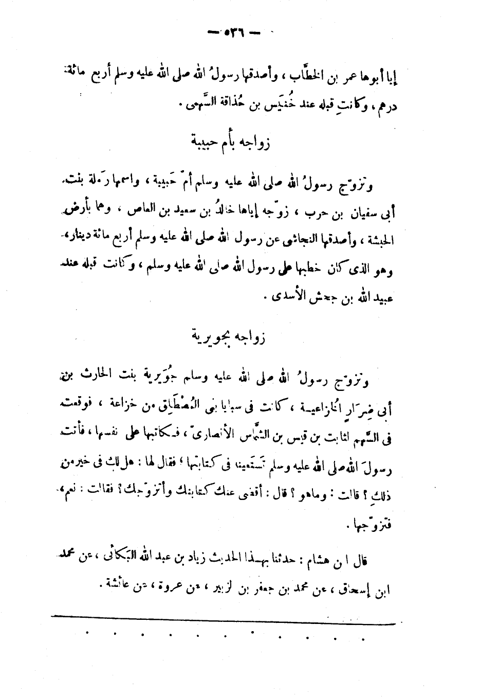 وَتَزَوّجَ رَسُولُ اللهِ صَلّى اللهُ عَلَيْهِ وَسَلّمَ أُمّ حَبِيبَةَ، وَاسْمُهَا رَمْلَةُ بِنْتُ أَبِي سُفْيَانَ بْنِ حَرْبٍ، زَوّجَهُ إيّاهَا خَالِدُ بْنُ سَعِيدِ بْنِ الْعَاصِ، وَهُمَا بِأَرْضِ الْحَبَشَةِ، وَأَصْدَقَهَا النّجَاشِيّ عَنْ رَسُولِ اللهِ صَلَّى اللَّهُ عَلَيْهِ وَسَلَّمَ أربع مائة دِينَارٍ، وَهُوَ الّذِي كَانَ خَطَبَهَا عَلَى رَسُولِ اللهِ صَلَّى اللَّهُ عَلَيْهِ وَسَلَّمَ، وَكَانَتْ قَبْلَهُ عِنْدَ عُبَيْدِ اللهِ بْنِ جَحْشٍ الْأَسَدِيّ.