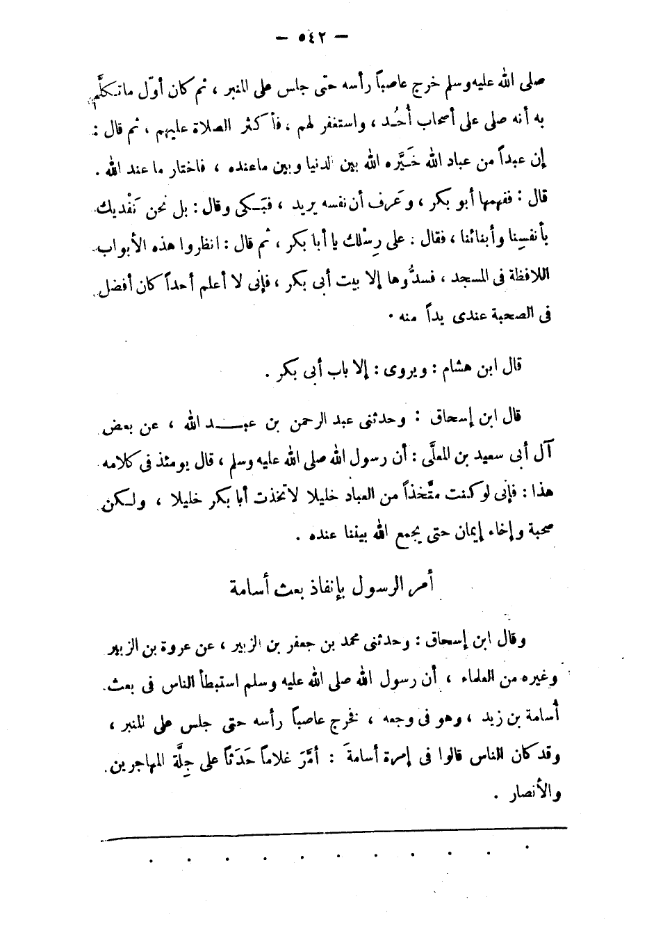 وَقَالَ ابْنُ إسْحَاقَ: وَحَدّثَنِي مُحَمّدُ بْنُ جَعْفَرِ بْنِ الزّبَيْرِ، عَنْ عُرْوَةَ بْنِ الزّبَيْرِ وَغَيْرِهِ مِنْ الْعُلَمَاءِ، أن رسول الله صلى الله عليه وسلم اسْتَبْطَأَ النّاسَ فِي بَعْثِ أُسَامَةَ بْنِ زَيْدٍ، وَهُوَ فِي وَجَعِهِ، فَخَرَجَ عَاصِبًا رَأْسَهُ حَتّى جَلَسَ عَلَى الْمِنْبَرِ، وَقَدْ كَانَ النّاسُ قَالُوا فِي إمْرَةِ أُسَامَةَ: أَمّرَ غُلَامًا حَدَثًا عَلَى جِلّةِ الْمُهَاجِرِينَ وَالْأَنْصَارِ.